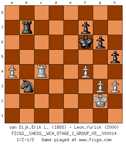 Last move : 1/2-1/2 2015 January 20 0:49:20 [Event "FICGS__CHESS__WCH_STAGE_1_GROUP_05__000014"] [Site "FICGS"] [Date "2014.11.01"] [Round "1"] [White "van Dijk,Erik L."] [Black "Leon,Yurick"] [Result "1/2-1/2"] [WhiteElo "1865"] [BlackElo "2000"] 1.e4 c5 2.Nf3 d6 3.b3 Nf6 4.Bb5+ Bd7 5.Qe2 Nc6 6.O-O g6 7.e5 Nxe5 8.Nxe5 dxe5 9.Bb2 Bg7 10.Bxe5 O-O 11.Nc3 Bf5 12.Bc4 Bh6 13.d4 Qa5 14.dxc5 Qxc5 15.Na4 Qc6 16.Bb2 Bg7 17.Rad1 a6 18.Qxe7 Rae8 19.Qb4 Rd8 20.Nb6 h5 21.Rfe1 Rde8 22.h3 Ne4 23.Bxg7 Kxg7 24.Bd5 Qxc2 25.Qd4+ Nf6 26.Bxb7 Be6 27.Qa1 Qc7 28.Nd5 Bxd5 29.Bxd5 Rxe1+ 30.Rxe1 Rc8 31.Bc4 a5 32.Re3 Rd8 33.g3 Rd6 34.Qe5 a4 35.Rd3 Rd7 36.Qxc7 Rxc7 37.Rd4 axb3 38.Bxb3 Nd7 39.Kg2 Nc5 40.Rc4 Kf6 41.a4 Rb7 42.f4 Nxb3 1/2-1/2 Sicilian Kingside Castling by player White (move 6) Kingside Castling by player Black (move 10) This chess game ended in a draw. Follow this game move after move (download)The blunders are all there on the board, waiting to be made. (Savielly Tartakover) Ein Teil des Fehlers ist immer korrekt. (Savielly Grigorievitsch Tartakower) Si tu oponente te ofrece un empate, trata de averiguar porque piensa él que esta en una posición peor. (Nigel Short) Seul un grand joueur sait à quel point il joue faiblement. (Xavier Tartacover) Men never do evil so completely and cheerfully as when they do it from religious conviction. (Blaise Pascal)