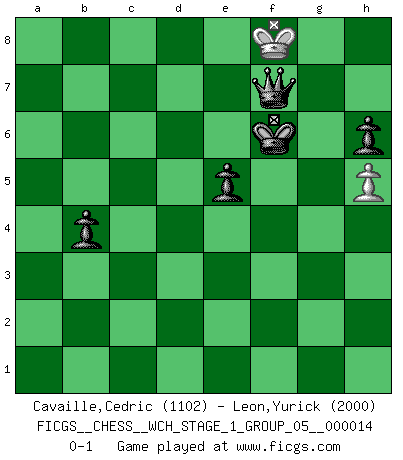 Last move : 0-1 2014 November 8 21:53:5 [Event "FICGS__CHESS__WCH_STAGE_1_GROUP_05__000014"] [Site "FICGS"] [Date "2014.11.01"] [Round "1"] [White "Cavaille,Cedric"] [Black "Leon,Yurick"] [Result "0-1"] [WhiteElo "1102"] [BlackElo "2000"] 1.d4 d5 2.Nf3 Nf6 3.e3 e6 4.c4 c6 5.Nc3 Nbd7 6.Bd2 Bd6 7.Qc2 O-O 8.b3 a6 9.Be2 dxc4 10.bxc4 c5 11.O-O b6 12.Ng5 Bb7 13.Bf3 Bxf3 14.Nxf3 cxd4 15.exd4 Qc7 16.Qd3 Rfc8 17.Rac1 Qxc4 18.Qxc4 Rxc4 19.Rfe1 Rac8 20.Ne2 Ba3 21.Rxc4 Rxc4 22.Rc1 Bxc1 23.Bxc1 Rc2 24.Kf1 Rxa2 25.Ne5 Nxe5 26.dxe5 Ng4 27.Bf4 Ra1+ 28.Nc1 Nxe5 29.Bxe5 Rxc1+ 30.Ke2 f6 31.Bd4 Rc6 32.h4 e5 33.Be3 Kf7 34.f4 Rc2+ 35.Kf3 Rc3 36.fxe5 Rxe3+ 37.Kxe3 fxe5 38.Ke4 Ke6 39.g4 h5 40.gxh5 b5 41.Kf3 Kf5 42.Ke3 a5 43.h6 gxh6 44.Kf3 a4 45.Ke3 a3 46.Kd2 a2 47.Kc3 a1Q+ 48.Kb4 Qa4+ 49.Kc5 b4 50.Kd6 Qb5 51.Ke7 Qc6 52.Kf7 Qd7+ 53.Kf8 Kf6 54.h5 Qf7+ 0-1 Queen's pawn game Kingside Castling by player Black (move 7) Kingside Castling by player White (move 11) 10 pieces endgame at move 37 : White KPPP , Black KPPPPP WHITE : King + 3 Pawns BLACK : King + 5 Pawns 9 pieces endgame at move 37 : White KPP , Black KPPPPP WHITE : King + 2 Pawns BLACK : King + 5 Pawns 8 pieces endgame at move 40 : White KPP , Black KPPPP WHITE : King + 2 Pawns BLACK : King + 4 Pawns 7 pieces endgame at move 43 : White KP , Black KPPPP WHITE : King + 1 Pawn BLACK : King + 4 Pawns Promotion Queen by player Black (move 47) Player Black won this chess game. Follow this game move after move (download)Chess books should be used as we use glasses: to assist the sight, although some players make use of them as if they thought they conferred sight. (Jose Raul Capablanca) Gegen einen Schachcomputer zu verlieren ist wie Löcher in den Strümpfen zuhaben. Es ist nicht peinlich, solange man der einzige ist der es weiß. (Anonymous) Debemos de asegurarnos de que el Ajedrez no se convierta en un lenguaje muerto, muy interesante, pero tan solo para un grupo muy pequeño. (Sytze Faber) Vouloir jouer aux échecs contre soi-même est aussi paradoxal que vouloir marcher sur son ombre. (Stefan Zweig) Empty your mind, be formless, shapeless — like water. (Bruce Lee)