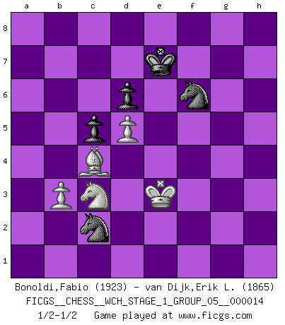 Last move : 1/2-1/2 2015 April 9 14:54:30 [Event "FICGS__CHESS__WCH_STAGE_1_GROUP_05__000014"] [Site "FICGS"] [Date "2014.11.01"] [Round "1"] [White "Bonoldi,Fabio"] [Black "van Dijk,Erik L."] [Result "1/2-1/2"] [WhiteElo "1923"] [BlackElo "1865"] 1.d4 c5 2.d5 Nf6 3.c4 g6 4.Nc3 Bg7 5.e4 d6 6.Nf3 O-O 7.Be2 e6 8.O-O exd5 9.cxd5 Re8 10.Nd2 b6 11.f3 Nh5 12.Nc4 Ba6 13.g4 Bd4+ 14.Kh1 Ng7 15.Bf4 Bxc4 16.Bxc4 a6 17.a4 Qe7 18.Qe2 h5 19.Rae1 hxg4 20.fxg4 Be5 21.Bxe5 Qxe5 22.Rf3 Re7 23.Ref1 Ne8 24.Qf2 R8a7 25.Bd3 f6 26.h4 Nd7 27.Kg2 Rh7 28.Rh1 Qe7 29.Rfh3 Ne5 30.Be2 Qg7 31.Qe3 Re7 32.Qg3 Nc7 33.b3 b5 34.h5 gxh5 35.Rxh5 Qg6 36.Rxh7 Rxh7 37.Rxh7 Kxh7 38.Qf4 Qh6 39.Qxh6+ Kxh6 40.axb5 axb5 41.Bxb5 Kg5 42.Kg3 Nxg4 43.Be2 Ne5 44.Bf1 f5 45.exf5 Kxf5 46.Bh3+ Kf6 47.Ne4+ Ke7 48.Nc3 Nd3 49.Bf1 Nb4 50.Bc4 Ne8 51.Kf4 Nf6 52.Ke3 Nc2+ 1/2-1/2 Old Benoni defense Kingside Castling by player Black (move 6) Kingside Castling by player White (move 8) 10 pieces endgame at move 45 : White KBNPP , Black KNNPP WHITE : King + 1 Bishop 1 Knight 2 Pawns BLACK : King + 2 Knights 2 Pawns This chess game ended in a draw. Follow this game move after move (download)There are tough players and nice guys, and I'm a tough player. (Bobby Fischer) Habe Mut, dich deines eigenen Verstandes zu bedienen. (Immanuel Kant) Una mala movida nulifica cuarenta buenas. (Horowitz) On entre au jeu d'Echecs comme on entre en Religion. Pour le joueur d'Echecs, la partie d'Echecs c'est l'office, la messe, le défilé du 1er Mai, le dépôt de gerbe au Monument aux Morts. C'est un drame sacré. (Michel Roos) Memory... is the diary that we all carry with us. (Oscar Wilde, The Importance of Being Earnest)