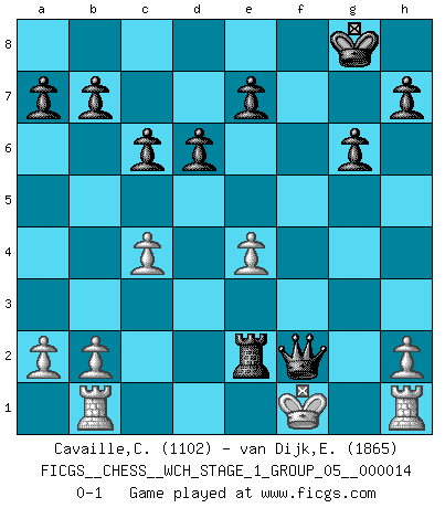 Last move : 0-1 2014 November 3 20:55:26 [Event "FICGS__CHESS__WCH_STAGE_1_GROUP_05__000014"] [Site "FICGS"] [Date "2014.11.01"] [Round "1"] [White "Cavaille,Cedric"] [Black "van Dijk,Erik L."] [Result "0-1"] [WhiteElo "1102"] [BlackElo "1865"] 1.d4 f5 2.c4 Nf6 3.Nf3 g6 4.Nc3 Bg7 5.Bg5 Ne4 6.Nxe4 fxe4 7.Nd2 Bxd4 8.Rb1 e3 9.Bxe3 Bxe3 10.fxe3 c6 11.e4 d6 12.e3 Qb6 13.Qf3 Nd7 14.Bd3 Ne5 15.Qe2 Bg4 16.Nf3 Qb4+ 17.Kf2 Nxf3 18.gxf3 O-O 19.Kg3 Bxf3 20.Qxf3 Rxf3+ 21.Kxf3 Qd2 22.Be2 Rf8+ 23.Kg3 Qxe3+ 24.Kg2 Rf2+ 25.Kg1 Rxe2 26.Kf1 Qf2+ 0-1 Dutch defense Kingside Castling by player Black (move 18) Player Black won this chess game. Follow this game move after move (download)Adequate compensation for a sacrifice is having a sound combination leading to a winning position; adequate compensation for a blunder is having your opponent snatch defeat from the jaws of victory. (Bruce A. Moon) Kasparov stellt für gewöhnlich die Regeln auf und bricht sie dann selbst wieder. (Alexej Shirov) Prefiero perder una partida realmente buena, que ganar una mala. (David Levy) A ce moment-là, je menaçais de comprendre la position ! (Clément L'Heureux) Plans are ideas that never come to fruition. (Daniel Parmet)