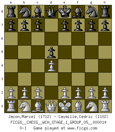 Last move : 0-1 2014 December 3 12:48:59 [Event "FICGS__CHESS__WCH_STAGE_1_GROUP_05__000014"] [Site "FICGS"] [Date "2014.11.01"] [Round "1"] [White "Jacon,Marcel"] [Black "Cavaille,Cedric"] [Result "0-1"] [WhiteElo "1712"] [BlackElo "1102"] 1.d4 d5 0-1 This chess game has been lost on time (started : 2014.11.01 20:44:28) Queen's pawn game Player Black won this chess game. Follow this game move after move (download)Chess is a terrific way for kids to build self image and self esteem. (Saudin Robovic) Spielt Blackmar-Diemer-Gambit, und das Matt kommt von selbst! (Emil Joseph Diemer) Cualquier cambio de material en una posición debe venir por medio de un mate, una captura o promoción de Peón. (Purdy) Demandez au pauvre Cg1 ce qu'il en pense. Eduard Gufeld à propos de la variante Saemisch de l'Est-Indienne. It is not enough to be a good player... you must also play well. (Siegbert Tarrasch)