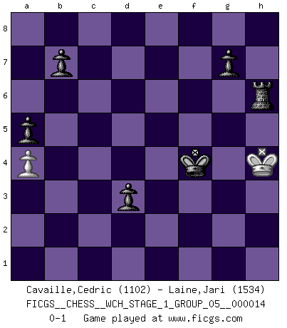 Last move : 0-1 2014 November 4 20:46:33 [Event "FICGS__CHESS__WCH_STAGE_1_GROUP_05__000014"] [Site "FICGS"] [Date "2014.11.01"] [Round "1"] [White "Cavaille,Cedric"] [Black "Laine,Jari"] [Result "0-1"] [WhiteElo "1102"] [BlackElo "1534"] 1.d4 d5 2.Nf3 Nc6 3.e3 Bg4 4.c4 e6 5.Be2 Bb4+ 6.Nc3 Nf6 7.a3 Bxc3+ 8.bxc3 O-O 9.O-O Ne4 10.Bd2 Na5 11.cxd5 exd5 12.Ne5 Bxe2 13.Qxe2 Nb3 14.Rfd1 Qe7 15.Ra2 Nbxd2 16.Nf3 Nxf3+ 17.Qxf3 Nxc3 18.Rb2 Nxd1 19.Qxd1 c5 20.dxc5 Rac8 21.Rc2 Rxc5 22.Rxc5 Qxc5 23.h3 Rc8 24.Kh2 f5 25.g4 fxg4 26.Qxg4 Qd6+ 27.f4 Rc2+ 28.Kg3 Qg6 29.Qxg6 hxg6 30.h4 Rc3 31.a4 d4 32.Kg4 Rxe3 33.h5 gxh5+ 34.Kxh5 Rg3 35.Kh4 Rg1 36.Kh3 Kf7 37.Kh2 Rg6 38.Kh3 Kf6 39.Kh4 Kf5 40.Kh5 Rg1 41.Kh4 Kxf4 42.Kh3 a5 43.Kh2 Rg6 44.Kh3 d3 45.Kh4 Rh6+ 0-1 Queen's pawn game, Chigorin variation Kingside Castling by player Black (move 8) Kingside Castling by player White (move 9) 10 pieces endgame at move 33 : White KPP , Black KRPPPPP WHITE : King + 2 Pawns BLACK : King + 1 Rook 5 Pawns 9 pieces endgame at move 34 : White KPP , Black KRPPPP WHITE : King + 2 Pawns BLACK : King + 1 Rook 4 Pawns 8 pieces endgame at move 41 : White KP , Black KRPPPP WHITE : King + 1 Pawn BLACK : King + 1 Rook 4 Pawns Player Black won this chess game. Follow this game move after move (download)Fischer wanted to give the Russians a taste of their own medicine. (Larry Evans) Ich kenne Menschen, die allen Willen der Welt besitzen und doch nicht Schach spielen können. (Robert James Fischer) El jugador de combinación piensa hacia adelante; comienza de la posición dada y trabaja las movidas contundentes en su mente. (Emanuel Lasker) La guerre est enfant de la passion, la passion est enfant du narcissisme et le narcissisme est l'enfant. (...) Une autre partie ? (Thibault de Vassal) It's unlucky to be superstitious. (Dave Enteles)
