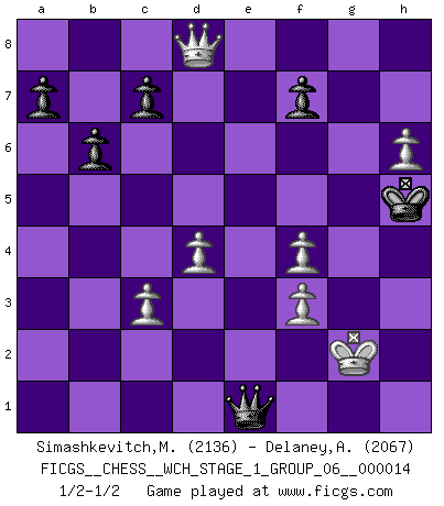 Last move : 1/2-1/2 2015 March 17 18:6:0 [Event "FICGS__CHESS__WCH_STAGE_1_GROUP_06__000014"] [Site "FICGS"] [Date "2014.11.01"] [Round "1"] [White "Simashkevitch,Mykola"] [Black "Delaney,Alan"] [Result "1/2-1/2"] [WhiteElo "2136"] [BlackElo "2067"] 1.e4 e5 2.Nf3 Nf6 3.Nxe5 d6 4.Nf3 Nxe4 5.d4 d5 6.Bd3 Nc6 7.O-O Be7 8.c4 Nb4 9.Be2 O-O 10.Nc3 Bf5 11.a3 Nxc3 12.bxc3 Nc6 13.Re1 Re8 14.cxd5 Qxd5 15.Bf4 Rac8 16.h3 h6 17.Nd2 Na5 18.Bf3 Qd7 19.Ne4 Rcd8 20.Ra2 b6 21.Rae2 Bxa3 22.Bg4 Be6 23.Bxh6 Bxg4 24.Nf6+ gxf6 25.Rxe8+ Rxe8 26.Rxe8+ Kh7 27.Qe1 Kxh6 28.Qe4 Kg7 29.Qa8 f5 30.Rh8 Bf3 31.gxf3 Bc1 32.h4 Bf4 33.Qf8+ Kf6 34.h5 Qd6 35.Qg8 Qe6 36.h6 Qe1+ 37.Kg2 Nc4 38.Qd8+ Kg6 39.Rg8+ Kh5 40.Re8 Ne3+ 41.Rxe3 Bxe3 42.fxe3 f4 43.exf4 1/2-1/2 Petrov : Classical attack Kingside Castling by player White (move 7) Kingside Castling by player Black (move 9) This chess game ended in a draw. Follow this game move after move (download)What is the object of playing a gambit opening?... To acquire a reputation of being a dashing player at the cost of losing a game. (Siegbert Tarrasch) Ich suche im Schach immer etwas Eigenes. Riskantes Spiel im Stile schachlicher Musketiere ist nicht meine Sache, auch wenn es vielen Freunden scharfer Wendungen gefällt. (Anatoly Karpov) Si yo gano un torneo, yo lo gano por mí mismo. Yo hago las jugadas. Nadie me ayuda. (Bobby Fischer) Le profane ne songe pas à la somme de jouissance dont il se prive, qui méconnaît ce jeu aux ressources aussi variées que passionnantes. (Jean-Marie Jeanton-Lamarche) Never was anything great achieved without danger. (Niccolo Machiavelli)
