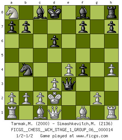 Last move : 1/2-1/2 2014 December 20 22:55:15 [Event "FICGS__CHESS__WCH_STAGE_1_GROUP_06__000014"] [Site "FICGS"] [Date "2014.11.01"] [Round "1"] [White "Tarmak,Mart"] [Black "Simashkevitch,Mykola"] [Result "1/2-1/2"] [WhiteElo "2000"] [BlackElo "2136"] 1.e4 e5 2.f4 exf4 3.Nf3 g5 4.h4 g4 5.Ne5 d6 6.Nxg4 Nf6 7.Nxf6+ Qxf6 8.Nc3 Nc6 9.Nd5 Qg6 10.d3 Qg3+ 11.Kd2 Nb4 12.Nxc7+ Kd8 13.Nxa8 Qe3+ 14.Kc3 Qc5+ 15.Kd2 Qe3+ 1/2-1/2 KGA : Kieseritsky, Kolisch defense This chess game ended in a draw. Follow this game move after move (download)Personally, I rather look forward to a computer program winning the world Chess Championship. Humanity needs a lesson in humility. (Richard Dawkings) Im Internet Chess Club betrug mein Rating vorübergehend 3350 ELO-Punkte. (Sergej Karjakin) El Peón aislado arroja penumbra sobre todo el tablero. (Aaron Nimzovich) Celui qui prend des risques peut perdre, celui qui n'en prend pas perd toujours. (Xavier Tartacover) I've never seen so many men wasted so badly. (Blondie in The Good, The Bad and The Ugly)