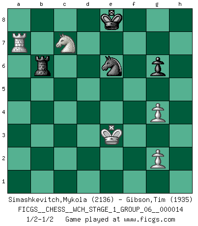 Last move : 1/2-1/2 2015 March 4 2:10:59 [Event "FICGS__CHESS__WCH_STAGE_1_GROUP_06__000014"] [Site "FICGS"] [Date "2014.11.01"] [Round "1"] [White "Simashkevitch,Mykola"] [Black "Gibson,Tim"] [Result "1/2-1/2"] [WhiteElo "2136"] [BlackElo "1935"] 1.e4 g6 2.d4 d6 3.Nc3 Nf6 4.f4 Bg7 5.Nf3 c5 6.Bb5+ Bd7 7.Bxd7+ Nbxd7 8.d5 Ng4 9.O-O c4 10.Qe1 Qa5 11.Nd1 Qxe1 12.Rxe1 O-O 13.Bd2 b5 14.Bc3 a6 15.a3 Rfc8 16.e5 dxe5 17.fxe5 f6 18.exf6 Ngxf6 19.Ne3 Re8 20.Rad1 Bh6 21.h3 Bf4 22.Ng4 Nxg4 23.hxg4 Bg3 24.Re6 Bd6 25.Ng5 Nc5 26.Re2 Bf4 27.Nf3 Bd6 28.Nd4 Na4 29.Bb4 Nxb2 30.Rde1 Bg3 31.Rf1 c3 32.Nc6 Bd6 33.Re6 Nc4 34.Rfe1 a5 35.Bxd6 Nxd6 36.R6e3 Kf8 37.Rxc3 Rac8 38.Re6 a4 39.Kf2 Nf7 40.R6e3 Nd6 41.Ke2 Rc7 42.Kd3 e6 43.Rxe6 Rxe6 44.dxe6 Nc4 45.Nd4 Rc5 46.Ke2 Ke7 47.Rh3 Kf8 48.Kf2 Ke8 49.Rxh7 Nxa3 50.Rb7 Nxc2 51.Nxb5 Rc6 52.Ra7 a3 53.Nxa3 Nd4 54.Ke3 Nxe6 55.Nb5 Rb6 56.Nc7+ 1/2-1/2 Robatsch (Modern) defense Kingside Castling by player White (move 9) Kingside Castling by player Black (move 12) 10 pieces endgame at move 53 : White KRNPPP , Black KRNP WHITE : King + 1 Rook 1 Knight 3 Pawns BLACK : King + 1 Rook 1 Knight 1 Pawn 9 pieces endgame at move 54 : White KRNPP , Black KRNP WHITE : King + 1 Rook 1 Knight 2 Pawns BLACK : King + 1 Rook 1 Knight 1 Pawn This chess game ended in a draw. Follow this game move after move (download)Different people feel differently about resigning. (Bobby Fischer) Capablanka war das größte Genie der Schachgeschichte! Aber denken sie nicht er habe nichts vom Schach verstanden. Er wusste nur soviel wie er wissen musste um seine Ziele zu erreichen. (Mikhail Moiseyevich Botvinik) Peones: ellos son el alma de esta partida, solos forman el ataque y la defensa. (Philidor) L'ordinateur a tué l'originalité. Il n'y a plus guère d'aventures sur l'échiquier. (Jacob Murray) If everyone is thinking alike, then somebody isn't thinking. (US General George S. Patton)
