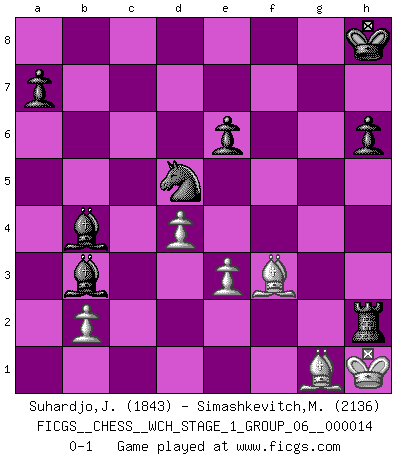 Last move : 0-1 2015 March 5 5:45:2 [Event "FICGS__CHESS__WCH_STAGE_1_GROUP_06__000014"] [Site "FICGS"] [Date "2014.11.01"] [Round "1"] [White "Suhardjo,Johanes"] [Black "Simashkevitch,Mykola"] [Result "0-1"] [WhiteElo "1843"] [BlackElo "2136"] 1.d4 d5 2.Nf3 Nf6 3.c4 c6 4.Qb3 dxc4 5.Qxc4 Bf5 6.g3 e6 7.Bg2 Nbd7 8.Nc3 Be7 9.O-O O-O 10.e3 b5 11.Qxc6 b4 12.Ne2 Bd3 13.Re1 Rc8 14.Qa4 Qb6 15.Nd2 Rfd8 16.Nf4 Bc2 17.Nb3 g5 18.Ne2 Bd3 19.Qa5 h6 20.h4 gxh4 21.gxh4 Qb8 22.Nf4 Be4 23.f3 Bc2 24.Bd2 e5 25.Ne2 Kh8 26.Rac1 Rg8 27.Rf1 e4 28.Nf4 exf3 29.Rxf3 Be4 30.Rxc8 Qxc8 31.Rf2 Qb7 32.Nc5 Nxc5 33.Qxb4 Ne6 34.Qxb7 Bxb7 35.Nxe6 fxe6 36.Be1 Bd5 37.Re2 Bxa2 38.Kh1 Nd5 39.Be4 Bb3 40.Bf2 Bb4 41.Bg1 Rg4 42.Bf3 Rxh4+ 43.Rh2 Rxh2+ 0-1 Queen's pawn game Kingside Castling by player White (move 9) Kingside Castling by player Black (move 9) Player Black won this chess game. Follow this game move after move (download)Many have become Chess Masters, no one has become the Master of Chess. (Siegbert Tarrasch) Kleine Schachspieler machen Mist, und große Schachspieler machen Mist, aber große machen weniger Mist. (Fritz Sämisch) Cuando veas una buena jugada, trata de encontrar otra mejor. (Emanuel Lasker) Il vaut toujours mieux jouer un plan faux de façon logique que de n'avoir pas de plan du tout. (Victor Kortchnoï) The absolute truth is the thing that makes people laugh. (Carl Reiner)