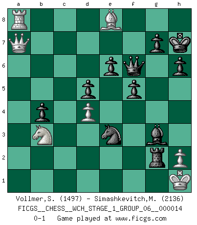 Last move : 0-1 2015 March 5 9:48:37 [Event "FICGS__CHESS__WCH_STAGE_1_GROUP_06__000014"] [Site "FICGS"] [Date "2014.11.01"] [Round "1"] [White "Vollmer,Steve"] [Black "Simashkevitch,Mykola"] [Result "0-1"] [WhiteElo "1497"] [BlackElo "2136"] 1.d4 d5 2.c4 c6 3.cxd5 cxd5 4.Nc3 Nf6 5.Nf3 e6 6.e3 Nbd7 7.Bd3 Be7 8.O-O O-O 9.b3 a6 10.Bb2 b5 11.a3 Bb7 12.Rc1 Rc8 13.Qe2 Ne4 14.b4 Nb6 15.Ne5 f6 16.Nf3 Bd6 17.Nd2 Nxd2 18.Qxd2 Nc4 19.Qe2 f5 20.f4 Rf6 21.Nd1 Rg6 22.Qf2 Ra8 23.Ra1 a5 24.Nc3 axb4 25.axb4 Bxb4 26.Rxa8 Qxa8 27.Ra1 Qe8 28.Nb1 Bd6 29.Bc1 Rf6 30.Nd2 Rf7 31.Nb3 Rc7 32.Bd2 Qe7 33.Qe1 Bc6 34.Qb1 h6 35.Ra6 b4 36.Qa2 Bb5 37.Ra8+ Kh7 38.Be1 Nxe3 39.Bxb5 Rc2 40.Qa7 Rxg2+ 41.Kh1 Qf6 42.Be8 Bxf4 43.Bg3 Bxg3 0-1 QGD Slav defense : Exchange variation Kingside Castling by player White (move 8) Kingside Castling by player Black (move 8) Player Black won this chess game. Follow this game move after move (download)Fischer, who may or may not be mad as a hatter, has every right to be horrified. (Jeremy Silman) Ich war schon mal beim Dopingtest. Da musste ich Urin abgeben, während Dritte zusahen. (Elisabeth Pähtz) En el tablero, la mentira e hipocresía no sobreviven mucho. (Emanuel Lasker) On entre au jeu d'Echecs comme on entre en Religion. Pour le joueur d'Echecs, la partie d'Echecs c'est l'office, la messe, le défilé du 1er Mai, le dépôt de gerbe au Monument aux Morts. C'est un drame sacré. (Michel Roos) To err is human, to shift the blame on someone else is tactical. (Mladen Jankovic)