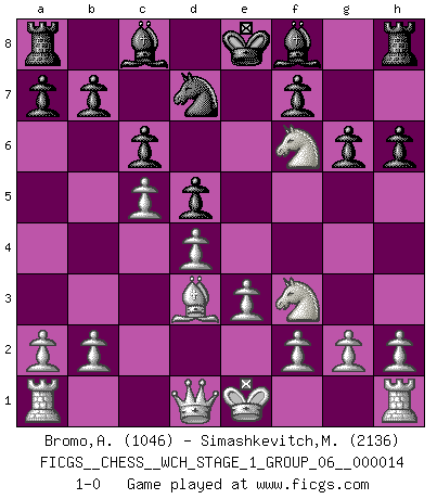 Last move : 1-0 2014 November 23 11:36:50 [Event "FICGS__CHESS__WCH_STAGE_1_GROUP_06__000014"] [Site "FICGS"] [Date "2014.11.01"] [Round "1"] [White "Bromo,Alexis"] [Black "Simashkevitch,Mykola"] [Result "1-0"] [WhiteElo "1046"] [BlackElo "2136"] 1.d4 d5 2.c4 c6 3.Nc3 Nf6 4.Nf3 e6 5.Bg5 h6 6.Bxf6 Qxf6 7.e3 Nd7 8.c5 e5 9.Bd3 e4 10.Nxe4 g6 11.Nxf6+ 1-0 QGD Slav defense Player White won this chess game. Follow this game move after move (download)In Chess, at least, the brave inherit the earth. (Edmar Mednis) Fischer machte Schach einfach zu einer aufregenden Sache, wann immer er sich ans Brett setzte. (Raymond Keene) Vive, pierde y aprende al observar a tu oponente como gana. (Amber Steenbock) Les Echecs ne sont pas pour les âmes timides. Ils requièrent un homme entier, qui ne s'arrête pas aveuglément à ce qui a été déjà établi, mais qui tente individuellement de sonder les profondeurs du jeu. (W. Steinitz) At last I discovered the true beauty of chess. So I proposed to her. (Dinesh De Silva)