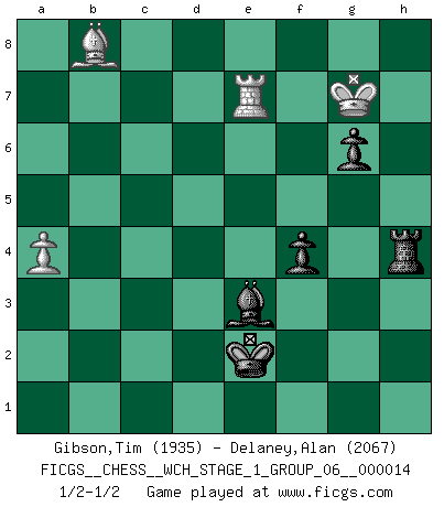 Last move : 1/2-1/2 2015 March 21 3:1:22 [Event "FICGS__CHESS__WCH_STAGE_1_GROUP_06__000014"] [Site "FICGS"] [Date "2014.11.01"] [Round "1"] [White "Gibson,Tim"] [Black "Delaney,Alan"] [Result "1/2-1/2"] [WhiteElo "1935"] [BlackElo "2067"] 1.e4 e5 2.Nf3 Nf6 3.Nxe5 d6 4.Nf3 Nxe4 5.d4 d5 6.Bd3 Nc6 7.O-O Be7 8.c4 Nb4 9.cxd5 Nxd3 10.Qxd3 Qxd5 11.Re1 Bf5 12.g4 Bg6 13.Nc3 Nxc3 14.Qxc3 f6 15.Bf4 Kf7 16.h4 h5 17.gxh5 Rxh5 18.Qxc7 Re8 19.Re3 Kf8 20.Rae1 Bb4 21.R1e2 Rxe3 22.Rxe3 Kg8 23.Qc8+ Kh7 24.a3 Rf5 25.Qb8 Ba5 26.b4 Bb6 27.Qd6 Bf7 28.Kh2 Qxd6 29.Bxd6 Bd5 30.Kg3 Bc6 31.Bf4 Kg6 32.Kg4 Rd5 33.Re7 Bd8 34.Re3 Kf7 35.Rc3 g6 36.Kg3 Ke6 37.Rd3 Bb6 38.Kg4 a5 39.bxa5 Rxa5 40.Nd2 Ra4 41.Re3+ Kd5 42.Nf3 Ra8 43.Rc3 Re8 44.Kg3 Re4 45.Rc1 Ba7 46.Rc3 Re2 47.Re3 Ra2 48.Bc7 Kc4 49.Bd6 Bb6 50.Re7 Bxf3 51.Kxf3 Bxd4 52.Rxb7 Rxf2+ 53.Kg4 f5+ 54.Kg5 Rg2+ 55.Kh6 Rg4 56.Bb8 f4 57.Rf7 Be3 58.Kg7 Kd3 59.a4 Ke2 60.Re7 Rxh4 1/2-1/2 Petrov : Classical attack Kingside Castling by player White (move 7) 10 pieces endgame at move 52 : White KRBPP , Black KRBPP WHITE : King + 1 Rook 1 Bishop 2 Pawns BLACK : King + 1 Rook 1 Bishop 2 Pawns 9 pieces endgame at move 60 : White KRBP , Black KRBPP WHITE : King + 1 Rook 1 Bishop 1 Pawn BLACK : King + 1 Rook 1 Bishop 2 Pawns This chess game ended in a draw. Follow this game move after move (download)When you absolutely don't know what to do anymore, it is time to panic. (John van der Wiel) Auf Remis zu spielen ist gewissermaßen ein Verbrechen gegen das Schachspiel. (Mikhail Nekhemyevich Tal) El Ajedrez se juega con la mente... ¡no con las manos!. (Renaud y Kahn) Il n'y a plus de joueurs du niveau de Jacob Murray dont la seule quête est le beau jeu, le plaisir de voir les pièces construire quelque chose. Sur 10 idées à la minute, 9 seront sans intérêt, la dernière s'avèrera géniale. (Christian Bauer) Gambling : The sure way of getting nothing from something. (Wilson Mizner)