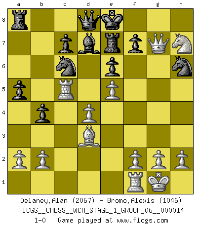 Last move : 1-0 2015 January 5 5:48:57 [Event "FICGS__CHESS__WCH_STAGE_1_GROUP_06__000014"] [Site "FICGS"] [Date "2014.11.01"] [Round "1"] [White "Delaney,Alan"] [Black "Bromo,Alexis"] [Result "1-0"] [WhiteElo "2067"] [BlackElo "1046"] 1.d4 d5 2.c4 e6 3.Nf3 h6 4.e3 Nf6 5.Bd3 a6 6.O-O Nc6 7.Nc3 Bd7 8.e4 dxc4 9.Bxc4 b5 10.Bd3 Bb4 11.Bd2 Bxc3 12.Bxc3 O-O 13.Rc1 b4 14.Bd2 Re8 15.Rc5 a5 16.Qc1 Kf8 17.Bxh6 gxh6 18.Qxh6+ Ke7 19.e5 Ng8 20.Qh4+ Kf8 21.Ng5 Re7 22.Nh7+ Ke8 23.Qg3 Nh6 24.Qg7 1-0 Queen's gambit declined Kingside Castling by player White (move 6) Kingside Castling by player Black (move 12) Player White won this chess game. Follow this game move after move (download)All Chess players should have a hobby. (Savielly Tartakower) Wie bekannt hörte Morphy 1859 auf, Schach zu spielen. Seine Enttäuschung galt nicht so sehr dem Schach, wie den Schachspielern. (Robert James Fischer) Debemos de asegurarnos de que el Ajedrez no se convierta en un lenguaje muerto, muy interesante, pero tan solo para un grupo muy pequeño. (Sytze Faber) Les erreurs sont comme les malheurs, elles n'arrivent jamais seules. (Siegbert Tarrasch) Computers make it easier to do a lot of things, but most of the things they make it easier to do don't need to be done. (Andy Rooney)