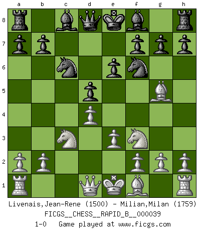 Last move : 1-0 2007 April 16 5:14:13 [Event "FICGS__CHESS__RAPID_B__000039"] [Site "FICGS"] [Date "2007.02.23"] [Round "1"] [White "Livenais,Jean-Rene"] [Black "Milian,Milan"] [Result "1-0"] [WhiteElo "1500"] [BlackElo "1759"] 1.c4 c6 2.Nc3 d5 3.cxd5 cxd5 4.d4 e6 5.Nf3 Nf6 6.Bg5 Nc6 7.e3 1-0 This chess game has been lost on time (started : 2007.02.23 8:58:7) English : Caro-Kann defensive system Player White won this chess game. Follow this game move after move (download)The essence of Chess is thinking about what Chess is. (David Bronstein) Herr Iljumschinow ist ein etwas merkwürdiger Geschäftsmann: Er arbeitet zusammen mit Leuten wie Muammar al-Gaddafi; früher ist das Saddam Hussein gewesen. (Joel Lautier) El Jaque al descubierto es el bombardero del tablero. (Reuben Fine) Une platitude souvent récitée à propos des Echecs est qu'une des choses les plus difficiles à réaliser est de gagner une position gagnante. Cela ne manque pas de sens mais, pour ma part, j'ai toujours trouvé plus difficile de gagner une position perdante. (Tim Krabbe) There's always a bigger fish. (Qui-Gon Jinn in Star Wars ep.1)