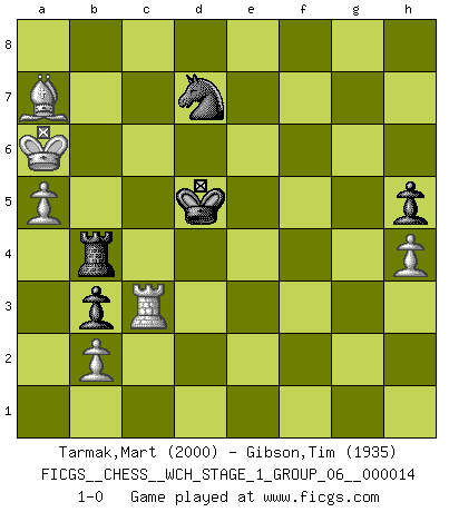 Last move : 1-0 2015 February 13 1:51:13 [Event "FICGS__CHESS__WCH_STAGE_1_GROUP_06__000014"] [Site "FICGS"] [Date "2014.11.01"] [Round "1"] [White "Tarmak,Mart"] [Black "Gibson,Tim"] [Result "1-0"] [WhiteElo "2000"] [BlackElo "1935"] 1.e4 g6 2.d4 d6 3.Nc3 Nf6 4.Be3 a6 5.Qd2 b5 6.f3 Nbd7 7.Nge2 Bb7 8.a4 b4 9.Nd1 c5 10.dxc5 dxc5 11.c3 e6 12.Nf2 Be7 13.Nc1 O-O 14.cxb4 cxb4 15.Nb3 Qb8 16.Be2 Rd8 17.Rc1 a5 18.Bb5 Nc5 19.Qc2 Nxb3 20.Qxb3 Ba6 21.Bxa6 Rxa6 22.Qc4 Ra8 23.Ke2 Rc8 24.Qxc8+ Qxc8 25.Rxc8+ Rxc8 26.Rd1 Kf8 27.Bb6 Ra8 28.Rc1 Nd7 29.Be3 Ke8 30.f4 Kd8 31.Kd3 h5 32.e5 g5 33.g3 gxf4 34.gxf4 Ke8 35.Ne4 f6 36.Bd4 fxe5 37.fxe5 Rd8 38.Nd6+ Bxd6 39.exd6 e5 40.Re1 Rc8 41.h4 b3 42.Bxe5 Nc5+ 43.Kc4 Kd7 44.Re3 Kc6 45.Bd4 Kxd6 46.Kb5 Nd7 47.Kxa5 Rb8 48.Rg3 Kd5 49.Bg1 Kc4 50.Rc3+ Kd5 51.Ba7 Rb7 52.Ka6 Rb4 53.a5 1-0 Robatsch (Modern) defense Kingside Castling by player Black (move 13) Player White won this chess game. Follow this game move after move (download)There must have been a time when men were demigods, or they could not have invented Chess. (Gustav Schenk) Spiel ein langweiliges Spiel zu Ende und lustige Dinge können passieren. (Hans Ree) Coloca el contenido de las piezas del Ajedrez en un sombrero, agitalo vigorosamente, arrojalas en un tablero desde una altura de 30 centimetros y así obtendras el estilo de Steinitz. (H. E. Bird) Que feriez-vous si vous étiez en train de jouer aux échecs et que la fin du monde arrive ? Je continuerais à jouer. (Saint Borromée) The obstacle is the path. (Zen proverb)