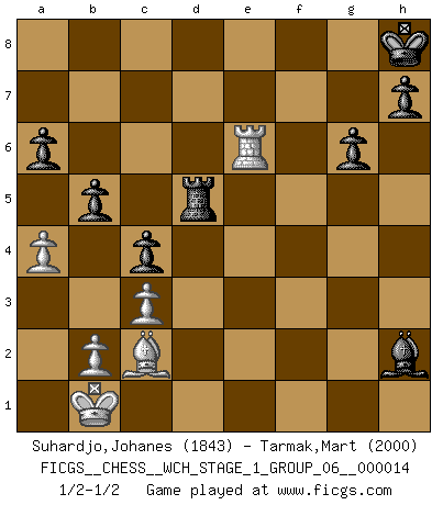 Last move : 1/2-1/2 2015 February 19 3:39:23 [Event "FICGS__CHESS__WCH_STAGE_1_GROUP_06__000014"] [Site "FICGS"] [Date "2014.11.01"] [Round "1"] [White "Suhardjo,Johanes"] [Black "Tarmak,Mart"] [Result "1/2-1/2"] [WhiteElo "1843"] [BlackElo "2000"] 1.e4 d6 2.d4 Nf6 3.Nc3 g6 4.f4 Bg7 5.Bd3 O-O 6.Nf3 Nc6 7.e5 dxe5 8.fxe5 Nh5 9.Be3 Bg4 10.Be2 f6 11.exf6 exf6 12.Qd2 Ne7 13.O-O-O Nf5 14.Bc4+ Kh8 15.Qf2 Nxe3 16.Qxe3 Re8 17.Qf2 f5 18.Kb1 c6 19.Rd3 Nf4 20.Rd2 Bxf3 21.Qxf3 Qd6 22.g3 Nh5 23.Rhd1 Nf6 24.Bb3 b5 25.d5 Ne4 26.Nxe4 fxe4 27.Qf4 Qxf4 28.gxf4 c5 29.c3 e3 30.Re2 Bh6 31.Rf1 c4 32.Bc2 Rad8 33.Rf3 Rxd5 34.a4 a6 35.Rfxe3 Rxe3 36.Rxe3 Bxf4 37.Re6 Bxh2 1/2-1/2 Pirc : Austrian attack Kingside Castling by player Black (move 5) Queenside Castling by player White (move 13) This chess game ended in a draw. Follow this game move after move (download)In complicated positions, Bobby Fischer hardly had to be afraid of anybody. (Paul Keres) Wenn du auf das Glück wartest, wird das Leben ziemlich langweilig. (Mikhail Nekhemyevich Tal) El Peón aislado arroja penumbra sobre todo el tablero. (Aaron Nimzovich) Demandez au pauvre Cg1 ce qu'il en pense. Eduard Gufeld à propos de la variante Saemisch de l'Est-Indienne. Life is like a play: it's not the length but the excellence of the acting that matters. (Seneca)