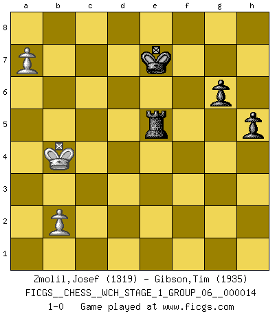 Last move : 1-0 2015 May 9 2:55:6 [Event "FICGS__CHESS__WCH_STAGE_1_GROUP_06__000014"] [Site "FICGS"] [Date "2014.11.01"] [Round "1"] [White "Zmolil,Josef"] [Black "Gibson,Tim"] [Result "1-0"] [WhiteElo "1319"] [BlackElo "1935"] 1.d4 d5 2.c4 e6 3.Nc3 f5 4.Nf3 Be7 5.Bf4 Nf6 6.e3 O-O 7.Bd3 Nc6 8.O-O Nb4 9.Be2 dxc4 10.Bxc4 Nbd5 11.Rc1 c6 12.Be5 Bd7 13.h3 Rc8 14.Be2 b5 15.Qd3 a6 16.Rfd1 Be8 17.a3 Qd7 18.Bh2 Bh5 19.Ne5 Bxe2 20.Nxe2 Qb7 21.Nf4 Nxf4 22.Bxf4 Nd5 23.Bg3 c5 24.dxc5 Rxc5 25.Rxc5 Bxc5 26.e4 fxe4 27.Qxe4 Re8 28.Nd3 Bf8 29.Nf4 Qd7 30.f3 g6 31.Nxd5 exd5 32.Qxd5+ Qxd5 33.Rxd5 Re2 34.Be5 Kf7 35.Kf1 Rc2 36.Bh8 Be7 37.Rd3 h5 38.Rd7 Ke6 39.Ra7 Rc1+ 40.Ke2 Rc2+ 41.Kd3 Rxg2 42.Rxa6+ Kf7 43.Be5 Rf2 44.Ke3 Rf1 45.Ra5 Re1+ 46.Kd4 Rd1+ 47.Ke4 Re1+ 48.Kd5 Rd1+ 49.Kc6 Rc1+ 50.Kxb5 Rh1 51.Ra7 Ke6 52.a4 Rxh3 53.a5 Rxf3 54.Rxe7+ Kxe7 55.a6 Rf5 56.a7 Rxe5+ 57.Kb4 1-0 QGD : 3.Nc3 Kingside Castling by player Black (move 6) Kingside Castling by player White (move 8) 10 pieces endgame at move 53 : White KRBPP , Black KRBPP WHITE : King + 1 Rook 1 Bishop 2 Pawns BLACK : King + 1 Rook 1 Bishop 2 Pawns 9 pieces endgame at move 54 : White KRBPP , Black KRPP WHITE : King + 1 Rook 1 Bishop 2 Pawns BLACK : King + 1 Rook 2 Pawns 8 pieces endgame at move 54 : White KBPP , Black KRPP WHITE : King + 1 Bishop 2 Pawns BLACK : King + 1 Rook 2 Pawns 7 pieces endgame at move 56 : White KPP , Black KRPP WHITE : King + 2 Pawns BLACK : King + 1 Rook 2 Pawns Player White won this chess game. Follow this game move after move (download)Chess is in its essence a game, in its form an art, and in its execution a science. (Baron Tassilo) Gewinnen beim Schach fördert das Selbstvertrauen. Beim Sex spüre ich sowas nicht... (Garry Kasparov) Muchos se han convertido en Maestros de Ajedrez, nadie se ha convertido en el Maestro del Ajedrez. (Siegbert Tarrasch) 'L'échange des dames est un coup dur pour les deux adversaires...' Un journaliste lors d'une partie du match Spassky-Fischer Experiences are the keys to life. (Daniel Parmet)