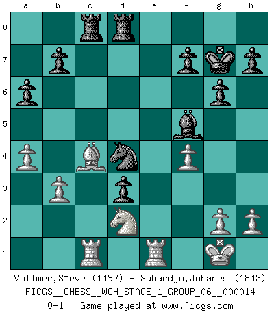 Last move : 0-1 2014 December 25 19:56:58 [Event "FICGS__CHESS__WCH_STAGE_1_GROUP_06__000014"] [Site "FICGS"] [Date "2014.11.01"] [Round "1"] [White "Vollmer,Steve"] [Black "Suhardjo,Johanes"] [Result "0-1"] [WhiteElo "1497"] [BlackElo "1843"] 1.d4 Nf6 2.c4 g6 3.Nc3 d5 4.e3 Bg7 5.Nf3 O-O 6.cxd5 Nxd5 7.Nxd5 Qxd5 8.Be2 c5 9.O-O Nc6 10.b3 cxd4 11.Bb2 e5 12.Bc4 Qa5 13.exd4 exd4 14.Qd2 Qxd2 15.Nxd2 Rd8 16.f4 Bf5 17.Rae1 a6 18.Rc1 d3 19.Bxg7 Kxg7 20.Rfe1 Rac8 21.a4 Nd4 0-1 King's Indian defense, 3.Nc3 Kingside Castling by player Black (move 5) Kingside Castling by player White (move 9) Player Black won this chess game. Follow this game move after move (download)No one ever won a game by resigning. (Unknown) Der Schachmeister von Heute braucht Courage, einen Killerinstinkt, Ausdauer und Arroganz. (Larry Evans) Ciertamente, de todas la drogas del mundo, el Ajedrez debe ser el mas placentero permamentemente. (Assiac) Les Echecs ne sont pas pour les âmes timides. Ils requièrent un homme entier, qui ne s'arrête pas aveuglément à ce qui a été déjà établi, mais qui tente individuellement de sonder les profondeurs du jeu. (W. Steinitz) Wisdom doesn't necessarily come with age. Sometimes age just shows up all by itself. (Tom Watson)