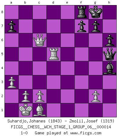 Last move : 1-0 2015 March 3 11:34:41 [Event "FICGS__CHESS__WCH_STAGE_1_GROUP_06__000014"] [Site "FICGS"] [Date "2014.11.01"] [Round "1"] [White "Suhardjo,Johanes"] [Black "Zmolil,Josef"] [Result "1-0"] [WhiteElo "1843"] [BlackElo "1319"] 1.e4 c6 2.d4 d5 3.Nd2 dxe4 4.Nxe4 Bf5 5.Ng3 Bg6 6.h4 h6 7.Nf3 Nd7 8.h5 Bh7 9.Bd3 Bxd3 10.Qxd3 e6 11.Bf4 Ngf6 12.O-O-O Be7 13.Ne5 O-O 14.Kb1 Nd5 15.Bc1 Nxe5 16.dxe5 Qa5 17.f4 Nb4 18.Qb3 Rad8 19.Rhf1 Rd5 20.a3 Na6 21.f5 Rxd1 22.Rxd1 Qxe5 23.Qxb7 Nc7 24.Rd3 Nd5 25.Qxc6 Bh4 26.Nf1 Qxf5 27.Ne3 Qxh5 28.Nxd5 exd5 29.Rxd5 1-0 Caro-Kann : 3.Nd2 Queenside Castling by player White (move 12) Kingside Castling by player Black (move 13) Player White won this chess game. Follow this game move after move (download)Of Chess it has been said that life is not long enough for it, but that is the fault of life, not Chess. (William Ewart Napier) Schach ist eine Sache der genauen Beurteilung, wann man zuschlagen und wann man sich ducken muss. (Robert James Fischer) Una partida de Ajedrez se divide en 3 etapas: la primera cuando piensas que tienes la ventaja, la segunda cuando crees que tienes la ventaja y la tercera... ¡cuando te das cuenta que vas a perder!. (Savielly Tartakower) Comme les marins qui ont mille raisons différentes d'aller en mer, les joueurs d'échecs en ont tout autant avant de s'installer devant une table et jouer... (Vincent Bertignac, philosophe) Don't be discouraged. It's often the last key in the bunch that opens the lock. (Author unknown)