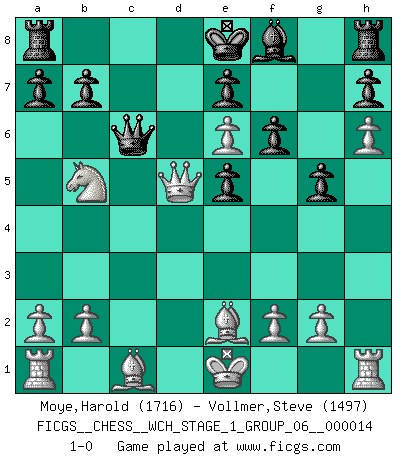 Last move : 1-0 2014 November 9 10:52:0 [Event "FICGS__CHESS__WCH_STAGE_1_GROUP_06__000014"] [Site "FICGS"] [Date "2014.11.01"] [Round "1"] [White "Moye,Harold"] [Black "Vollmer,Steve"] [Result "1-0"] [WhiteElo "1716"] [BlackElo "1497"] 1.e4 Nf6 2.e5 Nd5 3.d4 d6 4.Nf3 Nc6 5.c4 Nb6 6.e6 f6 7.d5 Ne5 8.Nxe5 dxe5 9.Bd3 g6 10.h4 Qd6 11.Nc3 c6 12.h5 g5 13.h6 cxd5 14.cxd5 Bxe6 15.Nb5 Qd7 16.dxe6 Qc6 17.Be2 Nd5 18.Qxd5 1-0 Alekhine's defense : Modern variation Player White won this chess game. Follow this game move after move (download)Robert Fischer is a law unto himself. (Larry Evans) Schachspieler können ausgezeichnet Varianten am Schachbrett berechnen, aber nicht im realen Leben. Zu stark ist der Individualismus im Schach ausgeprägt, und für viele ist ein kleiner momentaner persönlicher Vorteil wichtiger als ein weit größerer Vorteil von morgen. (Anatoly Karpov) Los Peones son nacidos libres, y aún así, se encuentran encadenados por todos lados. (Rick Kennedy) Fischer est le meilleur joueur du monde et Karpov n'est qu'un joueur de bistrot. (Garry Kasparov, agé de 16 ans) Train yourself to let go of everything you fear to lose. (Master Yoda in Star Wars ep.3)
