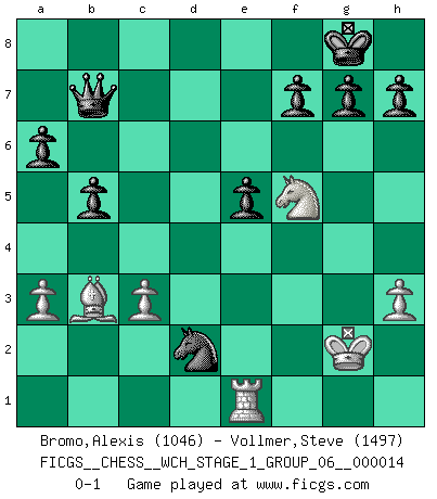 Last move : 0-1 2014 November 23 19:34:56 [Event "FICGS__CHESS__WCH_STAGE_1_GROUP_06__000014"] [Site "FICGS"] [Date "2014.11.01"] [Round "1"] [White "Bromo,Alexis"] [Black "Vollmer,Steve"] [Result "0-1"] [WhiteElo "1046"] [BlackElo "1497"] 1.d4 d5 2.c4 e6 3.a3 Nf6 4.Nc3 Nbd7 5.Nf3 Be7 6.e3 O-O 7.Bd3 a6 8.Bd2 dxc4 9.Bxc4 b5 10.Bb3 Bb7 11.h3 c5 12.dxc5 Bxc5 13.O-O Qe7 14.Ne2 Bxf3 15.gxf3 Ne5 16.Ng3 Qb7 17.e4 Rfd8 18.Qc2 Rac8 19.Bc3 Bd4 20.Rfd1 Nxf3+ 21.Kg2 Ng5 22.f3 e5 23.Nf5 Bxc3 24.bxc3 Ngxe4 25.fxe4 Nxe4 26.Rxd8+ Rxd8 27.Re1 Rd2+ 28.Qxd2 Nxd2 0-1 Queen's gambit declined Kingside Castling by player Black (move 6) Kingside Castling by player White (move 13) Player Black won this chess game. Follow this game move after move (download)Every Chess master was once a beginner. (Chernev) Kostenjuk hat keinen Sexappeal. (Loek van Wely) Solo existe una cosa que Fischer hace en el Ajedrez sin placer: ¡perder!. (Boris Spassky) La conception d'un plan est le processus par lequel un joueur exploite les avantages de sa position tout en s'efforçant d'en réduire au minimum les inconvénients. Afin de garantir le succès, un plan doit toujours se fonder sur un diagnostic objectif des particularités d'une position. La conception d'un plan est d'autant plus difficile que la position est équilibrée, et grandement facilitée lorsqu'il n'existe qu'un seul plan susceptible de répondre aux exigences de la position. (Harry Golombek) The question of whether computers can think is just like question of whether submarines can swim. (Edsger W. Dijkstra)