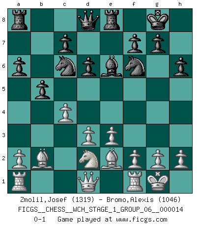 Last move : 0-1 2015 January 8 16:20:7 [Event "FICGS__CHESS__WCH_STAGE_1_GROUP_06__000014"] [Site "FICGS"] [Date "2014.11.01"] [Round "1"] [White "Zmolil,Josef"] [Black "Bromo,Alexis"] [Result "0-1"] [WhiteElo "1319"] [BlackElo "1046"] 1.b4 e5 2.Bb2 Bxb4 3.Bxe5 Nf6 4.Nf3 d6 5.Bb2 O-O 6.e3 Nc6 7.Be2 Re8 8.O-O h6 9.c3 Ba5 10.d3 Be6 11.Nbd2 a6 12.c4 Bxd2 13.Nxd2 b5 0-1 This chess game has been lost on time (started : 2014.11.01 21:26:56) Polish (Sokolsky) opening Kingside Castling by player Black (move 5) Kingside Castling by player White (move 8) Player Black won this chess game. Follow this game move after move (download)You cannot play at Chess if you are kind-hearted. (French Proverb) Ich war schon mal beim Dopingtest. Da musste ich Urin abgeben, während Dritte zusahen. (Elisabeth Pähtz) Fischer deseaba darle a los Rusos una sopa de su propia medicina. (Larry Evans) Il s'avisa de me proposer d'apprendre les échecs qu'il jouait un peu... me voilà forcené des échecs. J'achète un échiquier, je m'enferme dans ma chambre, j'y passe des jours et des nuits à vouloir apprendre par cur toutes les parties. (Jean-Jacques Rousseau, Confessions) Coffee just isn't my cup of tea. (Unknown)