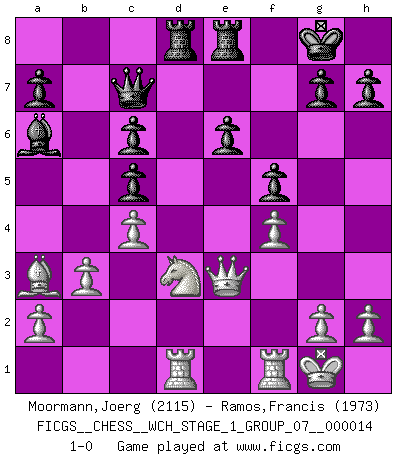Last move : 1-0 2015 January 12 14:34:23 [Event "FICGS__CHESS__WCH_STAGE_1_GROUP_07__000014"] [Site "FICGS"] [Date "2014.11.01"] [Round "1"] [White "Moormann,Joerg"] [Black "Ramos,Francis"] [Result "1-0"] [WhiteElo "2115"] [BlackElo "1973"] 1.e4 c5 2.Nc3 d6 3.f4 Nc6 4.Nf3 Nf6 5.Bb5 e6 6.Bxc6+ bxc6 7.d3 Be7 8.e5 Nd5 9.Ne4 f5 10.Nxd6+ Bxd6 11.exd6 Qxd6 12.Ne5 O-O 13.O-O Ba6 14.b3 Nf6 15.Ba3 Nd5 16.Qd2 Nb4 17.c3 Nxd3 18.Rad1 Rad8 19.Qe3 Rfe8 20.c4 Qc7 21.Nxd3 1-0 Sicilian : Closed Kingside Castling by player Black (move 12) Kingside Castling by player White (move 13) Player White won this chess game. Follow this game move after move (download)Chess is the art of analysis. (Mikhail Botvinnik) Frage des Reporters: -Welche besonderen Umstände rechtfertigen das Anhalten der Uhren während einer Turnierpartie? Antwort: -Einen Fotographen zu strangulieren. (Siegbert Tarrasch) Un Peón pasado aumenta su poder a medida de que el número de piezas en el tablero disminuye. (Capablanca) Karpov est une pièce de musée. (Garry Kasparov) Bobby never cared about money, though. His only desire was to prove that his choices were correct: He wanted chess to be important because he was a chess player, and he wanted to be important. Bobby knew money was important, but he didn't have a clue why, outside of clothes and status. The only way he could accomplish what he wanted was to fight for a lot of money. Once he got it, he gave it away. He did not know how to spend it. And once he'd become champion, after, essentially, sacrificing his life for it, he didn't know how to spend his time. (Bob Wade)
