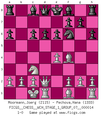 Last move : 1-0 2014 December 20 14:47:24 [Event "FICGS__CHESS__WCH_STAGE_1_GROUP_07__000014"] [Site "FICGS"] [Date "2014.11.01"] [Round "1"] [White "Moormann,Joerg"] [Black "Pechova,Hana"] [Result "1-0"] [WhiteElo "2115"] [BlackElo "1333"] 1.e4 c5 2.Nc3 Nc6 3.Nf3 d6 4.d4 cxd4 5.Nxd4 Nf6 6.Bg5 a6 7.Qd2 e6 8.O-O-O h6 9.Nxc6 bxc6 10.Bf4 1-0 This chess game has been lost on time (started : 2014.11.01 21:28:8) Sicilian : Closed, 2...Nc6 Queenside Castling by player White (move 8) Player White won this chess game. Follow this game move after move (download)Pawn endings are to Chess what putting is to golf. (Cecil Purdy) Sicherlich können nur Meister einen Stil haben. Daß ein nicht-Meister auch nur ein einziges Mal in seinem Leben eine Partie folgerecht durchführte, habe ich niemals bemerkt. (Emanuel Lasker) Un entendimiento a fondo de las continuaciones típicas del mate, hace de las combinaciones de sacrificio mas complicadas conducirlas a ellas no solo sin dificultad, sino casi de una manera natural. (Siegbert Tarrasch) Il (Jacob Murray) ne joue pas pour le bon coup, mais pour le meilleur. (Eloi Relange) Kids, you tried your best and you failed miserably. The lesson is, never try. (Simpsons)