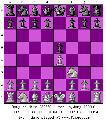 Last move : 1-0 2014 December 3 12:48:59 [Event "FICGS__CHESS__WCH_STAGE_1_GROUP_07__000014"] [Site "FICGS"] [Date "2014.11.01"] [Round "1"] [White "Douglas,Mike"] [Black "Yanyun,Wang"] [Result "1-0"] [WhiteElo "2069"] [BlackElo "2000"] 1.e4 e5 2.Nf3 1-0 This chess game has been lost on time (started : 2014.11.01 21:28:8) King's knight Opening Player White won this chess game. Follow this game move after move (download)Chess books should be used as we use glasses: to assist the sight, although some players make use of them as if they thought they conferred sight. (Jose Raul Capablanca) Im Reiche der Wirklichkeit ist man nie so glücklich wie im Reiche der Gedanken. (Arthur Schopenhauer) La enorme capacidad mental, en la que sin ella no puede un jugador de Ajedrez existir, es demasiado requerida por el Ajedrez al grado de que nunca podrá liberar su mente de este juego. (Albert Einstein) Je fais ceci parce que dans cinquante coups j'obtiendrai cela; je m'appelle Mikhail Moisevitch Botvinnik. (Botvinnik) All men can see these tactics whereby I conquer, but what none can see is the strategy out of which victory is evolved. (Sun Tzu)