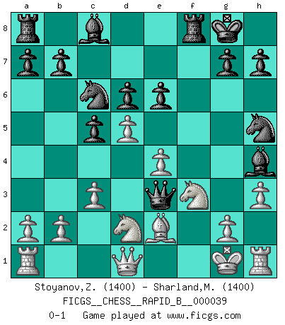 Last move : 0-1 2007 March 14 20:41:41 [Event "FICGS__CHESS__RAPID_B__000039"] [Site "FICGS"] [Date "2007.02.23"] [Round "1"] [White "Stoyanov,Zdravko"] [Black "Sharland,Michael"] [Result "0-1"] [WhiteElo "1400"] [BlackElo "1400"] 1.e4 c5 2.Nf3 d6 3.h3 Nf6 4.c3 Nc6 5.d3 e6 6.Bg5 Be7 7.Nbd2 O-O 8.Be2 Nh5 9.Be3 f5 10.d4 f4 11.d5 fxe3 12.fxe3 Bh4+ 13.Kf1 Qg5 14.Kg1 Qxe3+ 0-1 Sicilian Kingside Castling by player Black (move 7) Player Black won this chess game. Follow this game move after move (download)You know, comrade Pachman, I don't enjoy being a Minister, I would rather play Chess like you. (Che Guevara) Ich habe die Schachforschung dermaßen betrieben, dass sie auf eine wissenschaftliche Basis gestellt wurde. (Mikhail Moiseyevich Botvinik) Cuando tu casa esta en llamas, no puedes ser molestado por tus vecinos. O, como decinos en Ajedrez, si tu Rey esta bajo ataque, no te preocupa perder un Peón del lado de la Reina. (Gary Kasparov) Des idées, des idées, j'en ai cent, j'en ai mille. Des bonnes, des mauvaises, applicables, irréalisables... Il suffit de faire le tri ! (Roos) I live to kill Traxler counterattack. (Ilmars Cirulis)