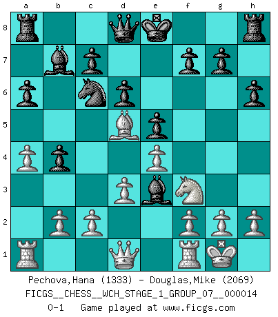 Last move : 0-1 2014 December 20 23:45:31 [Event "FICGS__CHESS__WCH_STAGE_1_GROUP_07__000014"] [Site "FICGS"] [Date "2014.11.01"] [Round "1"] [White "Pechova,Hana"] [Black "Douglas,Mike"] [Result "0-1"] [WhiteElo "1333"] [BlackElo "2069"] 1.e4 e5 2.Nf3 Nc6 3.Bb5 a6 4.Ba4 b5 5.Bb3 Nf6 6.O-O Bc5 7.a4 Bb7 8.d3 d6 9.Nc3 b4 10.Nd5 h6 11.Be3 Nxd5 12.Bxd5 Bxe3 0-1 Ruy Lopez : Caro variation Kingside Castling by player White (move 6) Player Black won this chess game. Follow this game move after move (download)In order to improve your game, you must study the endgame before everything else, for whereas the endings can be studied and mastered by themselves, the middle game and the opening must be studied in relation to the endgame. (Jose Raul Capablanca) Ich hatte Angst gegen einen russischen Großmeister zu verlieren, und er befürchtete gegen einen kleinen Jungen zu verlieren. (über ein Remis gegen Juri Awerbach). (Robert James Fischer) El Ajedrez es el gimnasio de la mente. (Blaise Pascal) Horreur, mais aussi harmonie suprême : qu'y avait-il en effet au monde en dehors des échecs ? Le brouillard, l'inconnu, le non-être... (Vladimir Nabokov) It's unlucky to be superstitious. (Dave Enteles)
