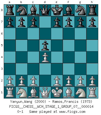 Last move : 0-1 2014 December 3 0:46:25 [Event "FICGS__CHESS__WCH_STAGE_1_GROUP_07__000014"] [Site "FICGS"] [Date "2014.11.01"] [Round "1"] [White "Yanyun,Wang"] [Black "Ramos,Francis"] [Result "0-1"] [WhiteElo "2000"] [BlackElo "1973"] 1.d4 d5 0-1 This chess game has been lost on time (started : 2014.11.01 21:28:8) Queen's pawn game Player Black won this chess game. Follow this game move after move (download)Morphy was probably the greatest genius of them all. (Bobby Fischer) Der Bart als Geschlechtszeichen mitten im Gesicht ist obszön. Daher gefällt er den Weibern. [Zugegeben, kein Schachzitat, aber unglaublich originell] (Arthur Schopenhauer) El Ajedrez es una hermosa aventura. (Bent Larsen) J'apprécie les joueurs d'est-indienne, c'est grâce à eux que je nourris ma famille depuis tant d'années. (Petrosian) If you don't practice you don't deserve to win. (Andre Agassi)