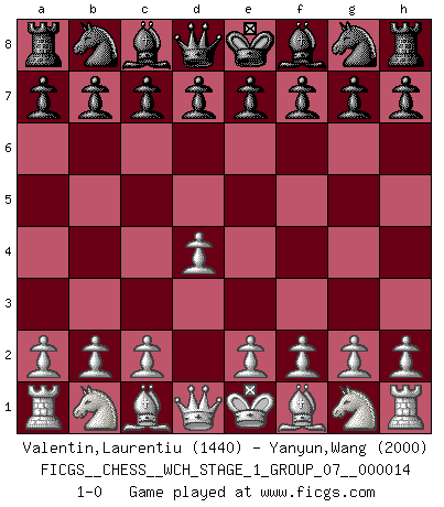 Last move : 1-0 2014 December 3 12:48:59 [Event "FICGS__CHESS__WCH_STAGE_1_GROUP_07__000014"] [Site "FICGS"] [Date "2014.11.01"] [Round "1"] [White "Valentin,Laurentiu"] [Black "Yanyun,Wang"] [Result "1-0"] [WhiteElo "1440"] [BlackElo "2000"] 1.d4 1-0 This chess game has been lost on time (started : 2014.11.01 21:28:8) Queen's pawn Player White won this chess game. Follow this game move after move (download)Weak points or holes in the opponent's position must be occupied by pieces not Pawns. (Siegbert Tarrasch) Gewinnen beim Schach fördert das Selbstvertrauen. Beim Sex spüre ich sowas nicht... (Garry Kasparov) Solo puedes ser bueno en el Ajedrez si amas al juego. (Bobby Fischer) La conception d'un plan est le processus par lequel un joueur exploite les avantages de sa position tout en s'efforçant d'en réduire au minimum les inconvénients. Afin de garantir le succès, un plan doit toujours se fonder sur un diagnostic objectif des particularités d'une position. La conception d'un plan est d'autant plus difficile que la position est équilibrée, et grandement facilitée lorsqu'il n'existe qu'un seul plan susceptible de répondre aux exigences de la position. (Harry Golombek) Creativity is inventing, experimenting, growing, taking risks, breaking rules, making mistakes, and having fun. (Mary Lou Cook)