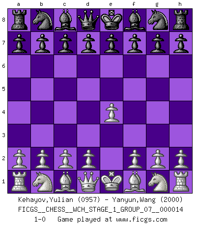 Last move : 1-0 2014 December 3 12:48:59 [Event "FICGS__CHESS__WCH_STAGE_1_GROUP_07__000014"] [Site "FICGS"] [Date "2014.11.01"] [Round "1"] [White "Kehayov,Yulian"] [Black "Yanyun,Wang"] [Result "1-0"] [WhiteElo "0957"] [BlackElo "2000"] 1.e4 1-0 This chess game has been lost on time (started : 2014.11.01 21:28:8) King's pawn Opening Player White won this chess game. Follow this game move after move (download)Chess is mental torture. (Garry Kasparov) Stelle das Brett so, daß die Sonne in die Augen deines Gegners scheint. (Ruy López) Yo siempre he tenido un ligero sentimiento de lástima por una persona que no tiene conocimiento del Ajedrez. (Siegbert Tarrasch) Aux échecs, les retours au sommet sont rares : les dommages psychologiques consécutifs à une défaite sont trop sévères. (Daily Telegraph) The leaves of memory seemed to make a mournful rustling in the dark. (Henry Wadsworth Longfellow)