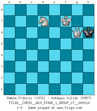 Last move : 1-0 2015 January 30 15:7:6 [Event "FICGS__CHESS__WCH_STAGE_1_GROUP_07__000014"] [Site "FICGS"] [Date "2014.11.01"] [Round "1"] [White "Ramos,Francis"] [Black "Kehayov,Yulian"] [Result "1-0"] [WhiteElo "1973"] [BlackElo "0957"] 1.e4 d6 2.d4 e5 3.Nf3 Nf6 4.Nc3 exd4 5.Nxd4 Be7 6.Bc4 O-O 7.O-O c5 8.Nde2 Nc6 9.h3 h6 10.Bf4 Na5 11.Bd5 Nxd5 12.Nxd5 Re8 13.Nxe7+ Qxe7 14.Bxd6 Qxe4 15.Nc3 Qg6 16.Bg3 b6 17.Nb5 Bd7 18.Qxd7 Qxc2 19.Nd6 Rf8 20.Rae1 Qxb2 21.a4 Qf6 22.Ne4 Qd8 23.Qb5 Qc8 24.Bd6 Re8 25.Ng3 Rxe1 26.Rxe1 Qc6 27.Nf5 Qxb5 28.axb5 Nc4 29.Be5 Nxe5 30.Rxe5 a6 31.bxa6 Rxa6 32.Re8+ Kh7 33.Nd6 f6 34.Rb8 Ra1+ 35.Kh2 Ra2 36.Kg3 Rb2 37.Nc4 Rc2 38.Nxb6 c4 39.Rc8 c3 40.Nd5 Rc1 41.Rxc3 Rxc3+ 42.Nxc3 g5 43.Nd5 Kg6 44.f4 Kf5 45.Kf3 Kg6 46.g4 Kf7 47.f5 Kg7 48.Ke4 Kf7 49.Nb6 Ke7 50.Kd5 Kf7 51.Kd6 Kg7 52.Ke7 Kh7 53.Kxf6 h5 54.Kxg5 hxg4 55.hxg4 Kg7 56.f6+ Kf7 57.Kf5 Kf8 58.Kg6 Kg8 59.Nd7 Kh8 60.Kf7 Kh7 61.Ke8 Kg6 62.f7 Kg5 63.f8Q Kxg4 64.Qf2 Kh3 65.Qg1 Kh4 66.Kf7 Kh5 67.Qg3 Kh6 68.Qg6+ 1-0 King's pawn Opening Kingside Castling by player Black (move 6) Kingside Castling by player White (move 7) 10 pieces endgame at move 41 : White KNPPP , Black KRPPP WHITE : King + 1 Knight 3 Pawns BLACK : King + 1 Rook 3 Pawns 9 pieces endgame at move 42 : White KNPPP , Black KPPP WHITE : King + 1 Knight 3 Pawns BLACK : King + 3 Pawns 8 pieces endgame at move 53 : White KNPPP , Black KPP WHITE : King + 1 Knight 3 Pawns BLACK : King + 2 Pawns 7 pieces endgame at move 54 : White KNPPP , Black KP WHITE : King + 1 Knight 3 Pawns BLACK : King + 1 Pawn 6 pieces endgame at move 54 : White KNPP , Black KP WHITE : King + 1 Knight 2 Pawns BLACK : King + 1 Pawn 5 pieces endgame at move 55 : White KNPP , Black K WHITE : King + 1 Knight 2 Pawns BLACK : King + Promotion Queen by player White (move 63) 4 pieces endgame at move 63 : White KQN , Black K WHITE : King + 1 Queen 1 Knight BLACK : King + Player White won this chess game. Follow this game move after move (download)Fischer was a master of clarity and a king of artful positioning. His opponents would see where he was going but were powerless to stop him. (Bruce Pandolfini) Wenn Du nicht kämpfst, um anderen etwas zu beweisen, sondern nur für Dich selbst, dann bist du fast unbesiegbar. (Garry Kasparov) El Ajedrez es una manera fabulosa para que los niños aprendan a autovalorarse y a autoestimarse. (Saudin Robovic) Même un GMI sait rarement calculer sur plus de cinq coups une attaque à sacrifices. (Rudolf Spielmann) Crush them ! Make them suffer ! (General Grievous in Star Wars ep.3)