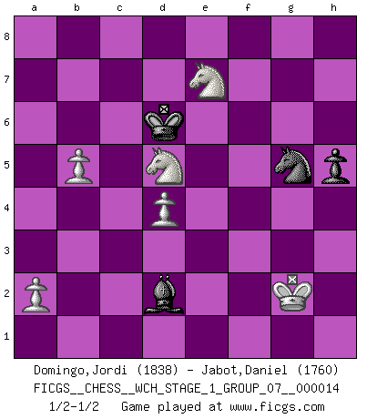 Last move : 1/2-1/2 2015 March 31 19:56:8 [Event "FICGS__CHESS__WCH_STAGE_1_GROUP_07__000014"] [Site "FICGS"] [Date "2014.11.01"] [Round "1"] [White "Domingo,Jordi"] [Black "Jabot,Daniel"] [Result "1/2-1/2"] [WhiteElo "1838"] [BlackElo "1760"] 1.g4 d5 2.Bg2 c6 3.h3 e5 4.d4 e4 5.c4 Bd6 6.Nc3 Ne7 7.Bg5 f6 8.Bd2 O-O 9.Qb3 Kh8 10.e3 Bc7 11.Nge2 f5 12.O-O-O b5 13.cxb5 a6 14.b6 Bxb6 15.f3 Ng6 16.gxf5 Nh4 17.fxe4 Nxg2 18.exd5 cxd5 19.Rhg1 Nc6 20.Rxg2 Bxf5 21.Rdg1 g6 22.Qxd5 Qc7 23.e4 Ne7 24.Bf4 Nxd5 25.Bxc7 Nxc7 26.exf5 Rxf5 27.Rg5 Rf3 28.R1g3 Rf1+ 29.Kd2 Ne8 30.Re3 Ng7 31.Rd5 Rb8 32.Rd7 Nf5 33.Re5 Rf2 34.Ke1 Rh2 35.Na4 Nh4 36.Kd1 Nf3 37.R5e7 Rh1+ 38.Kc2 Ne1+ 39.Kd2 Ba5+ 40.Nac3 Nf3+ 41.Ke3 Ng5 42.Kf4 h6 43.Kg4 Bb4 44.Rg7 Rg8 45.Rxg8+ Kxg8 46.Ra7 Nxh3 47.Rxa6 Kf7 48.Nd5 h5+ 49.Kg3 Bd2 50.Rf6+ Kg7 51.Kg2 Re1 52.Re6 Ng5 53.Re7+ Kf8 54.Nef4 Rxe7 55.Nxg6+ Kf7 56.Ngxe7 Ke6 57.b4 Kd6 58.b5 1/2-1/2 Grob's attack Kingside Castling by player Black (move 8) Queenside Castling by player White (move 12) 10 pieces endgame at move 56 : White KNNPPP , Black KBNP WHITE : King + 2 Knights 3 Pawns BLACK : King + 1 Bishop 1 Knight 1 Pawn This chess game ended in a draw. Follow this game move after move (download)Chess is not like life... it has rules ! (Mark Pasternak) Man wirke der falschen Auffassung entgegen, als ob jeder Zug Unmittelbares zu leisten habe; auch Werte- und Ruhezüge haben ihre Existenzberechtigung. (Aaron Nimzowitsch) En el Ajedrez, cuando menos, el valiente hereda la tierra. (Edmar Mednis) Il (Jacob Murray) ne joue pas pour le bon coup, mais pour le meilleur. (Eloi Relange) A person who never made a mistake never tried anything new. (Albert Einstein)