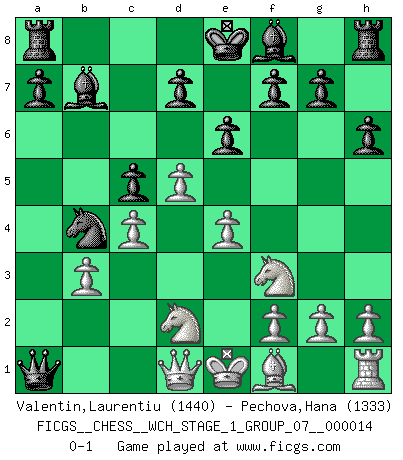 Last move : 0-1 2015 January 30 18:37:49 [Event "FICGS__CHESS__WCH_STAGE_1_GROUP_07__000014"] [Site "FICGS"] [Date "2014.11.01"] [Round "1"] [White "Valentin,Laurentiu"] [Black "Pechova,Hana"] [Result "0-1"] [WhiteElo "1440"] [BlackElo "1333"] 1.d4 Nf6 2.c4 c5 3.d5 b5 4.b3 e6 5.Bg5 h6 6.Bxf6 Qxf6 7.Nd2 Bb7 8.e4 Na6 9.a3 b4 10.axb4 Nxb4 11.Ngf3 Qxa1 0-1 This chess game has been lost on time (started : 2014.11.01 21:28:8) Benko gambit Player Black won this chess game. Follow this game move after move (download)All that matters on the Chessboard is good moves. (Bobby Fischer) Ich tröste mich mit dem Vergnügen, daß Schachfans, Zuschauer und Leser glücklich sind, wenn ein Großmeister etwas riskiert, statt nur Klötzchen zu schieben. (Mikhail Nekhemyevich Tal) Un jugador que trata de regresar una movida en el Ajedrez es un futuro carterista. (Richard Fenton) Horreur, mais aussi harmonie suprême : qu'y avait-il en effet au monde en dehors des échecs ? Le brouillard, l'inconnu, le non-être... (Vladimir Nabokov) You can't play chess if you're groggy from pills. (Anatoly Karpov)