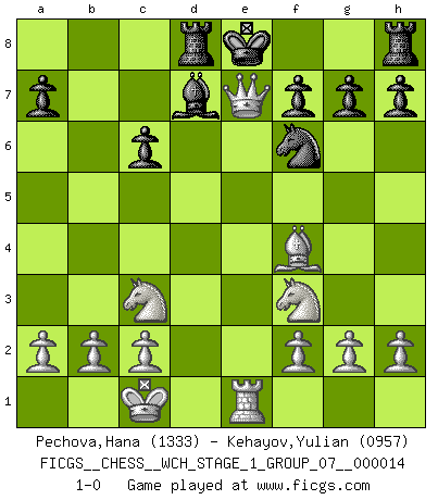 Last move : 1-0 2015 January 9 23:30:12 [Event "FICGS__CHESS__WCH_STAGE_1_GROUP_07__000014"] [Site "FICGS"] [Date "2014.11.01"] [Round "1"] [White "Pechova,Hana"] [Black "Kehayov,Yulian"] [Result "1-0"] [WhiteElo "1333"] [BlackElo "0957"] 1.e4 e5 2.Nc3 c6 3.d4 exd4 4.Qxd4 d6 5.Bf4 Nf6 6.O-O-O c5 7.Qe3 Be7 8.e5 dxe5 9.Rxd8+ Bxd8 10.Qxe5+ Be6 11.Bb5+ Nc6 12.Bxc6+ bxc6 13.Qxc5 Bd7 14.Nf3 Be7 15.Re1 Rd8 16.Qxe7+ 1-0 Vienna game Queenside Castling by player White (move 6) Player White won this chess game. Follow this game move after move (download)The game of chess is the touchstone of the intellect. (Goethe) Obwohl ich alt bin, darf mir niemand den Finger in den Mund stecken, sonst beisse ich. (Wilhelm Steinitz) Aquel que toma al Peón de Caballo de la Reina, se pasará la noche a dormir en la calle. (Anónimo) Tous ces prétendus hommes politiques sont les pions, les Cavaliers, les Tours ou les Fous d'une partie d'échecs qui se jouera tant qu'un hasard ne renversera pas l'échiquier. (Honoré de Balzac) It is not titles that honor men, but men that honor titles. (Niccolo Machiavelli)