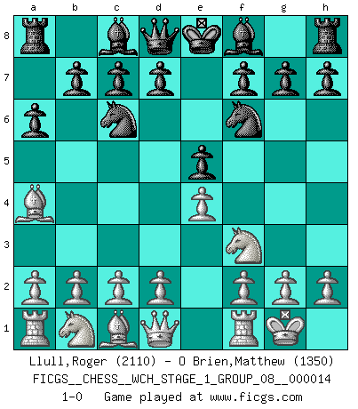 Last move : 1-0 2014 December 6 0:53:30 [Event "FICGS__CHESS__WCH_STAGE_1_GROUP_08__000014"] [Site "FICGS"] [Date "2014.11.01"] [Round "1"] [White "Llull,Roger"] [Black "O Brien,Matthew"] [Result "1-0"] [WhiteElo "2110"] [BlackElo "1350"] 1.e4 e5 2.Nf3 Nc6 3.Bb5 a6 4.Ba4 Nf6 5.O-O 1-0 This chess game has been lost on time (started : 2014.11.01 21:28:10) Ruy Lopez : 5.O-O Kingside Castling by player White (move 5) Player White won this chess game. Follow this game move after move (download)A man without frontiers. He didn't divide the East and the West, he brought them together in their admiration for him. (Ljubomir Ljubojevic, about Bobby Fischer's death) Karpov ist ein Museumsstück. (Garry Kasparov) Una victoria por una combinación errónea, aunque sea espectacular, me llena de horror artístico. (Wilhelm Steinitz) Karpov est une pièce de musée. (Garry Kasparov) Thibault, I ask for draw. Game 13876. - Sorry Ilmars, you won. (FICGS chat)