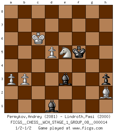 Last move : 1/2-1/2 2015 February 16 18:57:45 [Event "FICGS__CHESS__WCH_STAGE_1_GROUP_08__000014"] [Site "FICGS"] [Date "2014.11.01"] [Round "1"] [White "Permykov,Andrey"] [Black "Lindroth,Pasi"] [Result "1/2-1/2"] [WhiteElo "2081"] [BlackElo "2000"] 1.e4 c5 2.Nf3 d6 3.d4 cxd4 4.Nxd4 Nf6 5.Nc3 a6 6.f3 e5 7.Nb3 Be6 8.Be3 Be7 9.Qd2 O-O 10.O-O-O Nbd7 11.g4 b5 12.g5 Nh5 13.Kb1 Nb6 14.Nd5 Nxd5 15.exd5 Bf5 16.Na5 f6 17.h4 Ng3 18.Nc6 Qd7 19.Rg1 Nxf1 20.Rdxf1 fxg5 21.hxg5 Bg6 22.Rg2 Rae8 23.Rgf2 Bd8 24.b3 Rf5 25.Kb2 Bh5 26.a3 Ref8 27.f4 exf4 28.Bxf4 Bg6 29.Be3 Rxf2 30.Rxf2 Rxf2 31.Qxf2 Be7 32.Qf4 Bf8 33.Nd4 Qf7 34.Qxf7+ Kxf7 35.Bf4 Be4 36.c4 h5 37.gxh6 gxh6 38.Ne6 Be7 39.Kc3 Kg6 40.Nc7 h5 41.Ne8 h4 42.Nxd6 Bf3 43.cxb5 axb5 44.Kd4 Bf6+ 45.Kc5 Bg5 46.Bh2 Be3+ 47.Kc6 h3 48.Nxb5 Kf5 49.Nd6+ Kg5 50.Nf7+ Kf5 51.Ne5 Bd1 1/2-1/2 Sicilian : Najdorf Kingside Castling by player Black (move 9) Queenside Castling by player White (move 10) 10 pieces endgame at move 48 : White KBNPPP , Black KBBP WHITE : King + 1 Bishop 1 Knight 3 Pawns BLACK : King + 2 Bishops 1 Pawn This chess game ended in a draw. Follow this game move after move (download)Don't even mention losing to me. I can't stand to think of it. (Bobby Fischer) Ich verachte Kasparow. (Viktor Kortschnoi) El Ajedrez detiene a su maestro dentro de sus propios vínculos, encadenando la mente y el cerebro, por lo que la libertad interior del mas fuerte debe sufrir. (Albert Einstein) Donnez-moi un Cavalier en 6e et je gagnerais toutes mes parties. (Steinitz) I've lost money so fast in these clubs it's left me reeling. I've read every poker book ever written, but the only way to get better at the game is to go out and play with people who are really good. The problem is, you stand to lose a lot of money doing it. (Matt Damon)