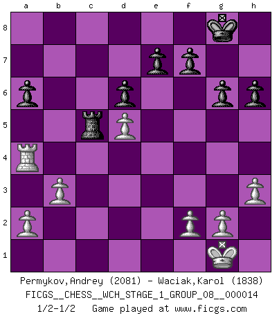 Last move : 1/2-1/2 2014 December 12 10:43:55 [Event "FICGS__CHESS__WCH_STAGE_1_GROUP_08__000014"] [Site "FICGS"] [Date "2014.11.01"] [Round "1"] [White "Permykov,Andrey"] [Black "Waciak,Karol"] [Result "1/2-1/2"] [WhiteElo "2081"] [BlackElo "1838"] 1.e4 c5 2.Nf3 d6 3.d4 cxd4 4.Nxd4 Nf6 5.Nc3 a6 6.Bg5 Nbd7 7.Bc4 Qc7 8.Qe2 h6 9.Bh4 b5 10.Bd5 Bb7 11.Bxf6 Nxf6 12.Ndxb5 Qb6 13.Bxb7 Qxb7 14.Nd4 g6 15.O-O Bg7 16.Rab1 O-O 17.Rfd1 Rab8 18.h3 Rfc8 19.Qe3 Qa7 20.b3 Rb7 21.Rbc1 Rbc7 22.Nd5 Nxd5 23.exd5 Bxd4 24.Qxd4 Qxd4 25.Rxd4 Rxc2 26.Rxc2 Rxc2 27.Ra4 Rc5 1/2-1/2 Comment by player 2 : Karol Waciak : A big ooops! Sicilian : Najdorf, 6.Bg5 Kingside Castling by player White (move 15) Kingside Castling by player Black (move 16) This chess game ended in a draw. Follow this game move after move (download)I had a toothache during the first game. In the second game I had a headache. In the third game it was an attack of rheumatism. In the fourth game, I wasn't feeling well. And in the fifth game? Well, must one have to win every game ? (Siegbert Tarrasch) Das ganze Leben mit einer Ehefrau ist wie ein Endspiel mit ungleichfarbigen Läufern. (Viktor Kortschnoi) Tu no necesitas jugar muy bien, únicamente ayudar a tu oponenet a que juegue muy mal. (Genrikh Chepukaitis) Je ne crois pas en la psychologie, je crois aux bons coups. (Robert Fischer) Control your own destiny or someone else will. (Jack Welch)