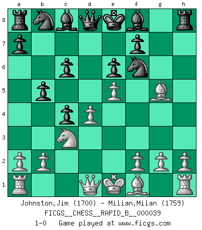 Last move : 1-0 2007 April 8 10:19:55 [Event "FICGS__CHESS__RAPID_B__000039"] [Site "FICGS"] [Date "2007.02.23"] [Round "1"] [White "Johnston,Jim"] [Black "Milian,Milan"] [Result "1-0"] [WhiteElo "1700"] [BlackElo "1759"] 1.d4 d5 2.c4 c6 3.Nf3 Nf6 4.Nc3 e6 5.Bg5 dxc4 6.e4 b5 7.e5 h6 8.Bh4 g5 9.Nxg5 hxg5 10.Bxg5 1-0 This chess game has been lost on time (started : 2007.02.23 8:58:7) QGD Slav : 4.Nc3 Player White won this chess game. Follow this game move after move (download)Chess is as much a mystery as women. (Purdy) Eine Person mit durchschnittlichem IQ kann etwa eine ELO von 2000 erreichen. (Jonathan Levitt) ¿Se han dado cuenta de que Fischer casi nunca ha tenido piezas malas? El las intercambia y las piezas malas se quedan con sus oponenets. (Yuri Balashov) Pour moi, les échecs ne sont pas un jeu mais un art. (Alexandre Alekhine) Art is not a thing, it is a way. (Elbert Hubbard)