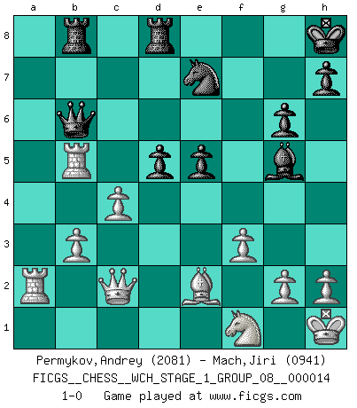 Last move : 1-0 2015 February 26 20:24:43 [Event "FICGS__CHESS__WCH_STAGE_1_GROUP_08__000014"] [Site "FICGS"] [Date "2014.11.01"] [Round "1"] [White "Permykov,Andrey"] [Black "Mach,Jiri"] [Result "1-0"] [WhiteElo "2081"] [BlackElo "0941"] 1.e4 c5 2.Nf3 Nc6 3.d4 cxd4 4.Nxd4 Nf6 5.Nc3 e5 6.Ndb5 d6 7.Bg5 a6 8.Na3 b5 9.Nd5 Be7 10.Bxf6 Bxf6 11.c3 O-O 12.Nc2 Bg5 13.a4 bxa4 14.Rxa4 a5 15.Bc4 Rb8 16.b3 Kh8 17.Nce3 g6 18.O-O f5 19.Qd3 Be6 20.Ra2 fxe4 21.Qxe4 Qd7 22.Rfa1 Qb7 23.Rd1 Qf7 24.f3 Qa7 25.Kh1 Qb7 26.Qd3 Qd7 27.Qc2 Qd8 28.Nf1 Bxd5 29.Rxd5 Ne7 30.Rdxa5 d5 31.Be2 Qb6 32.c4 Rfd8 33.Rb5 1-0 This chess game has been lost on time (started : 2014.11.01 21:28:10) Sicilian : Pelikan (Lasker/Sveshnikov) variation Kingside Castling by player Black (move 11) Kingside Castling by player White (move 18) Player White won this chess game. Follow this game move after move (download)By the beauty of his games, the clarity of his play, and the brilliance of his ideas, Fischer made himself an artist of the same stature as Brahms, Rembrandt, and Shakespeare. (David Levy) Ein Remis kann durch Wiederholung von drei Zügen oder durch einen schlechte Zug erreicht werden. (Savielly Grigorievitsch Tartakower) Yo tuve un dolor de muelas en la primer partida. En el segundo juego, tuve un dolor de cabeza. En el tercero, tuve un ataque de reumatísmo. En la cuarta partida, no me sentía muy bien. ¿Y en el quinto juego? Bueno, ¿que acaso uno tiene que ganar todos los juegos?. (Siegbert Tarrasch) Il vaut mieux sacrifier les pièces de l'adversaire. (Xavier Tartacover) Indecision is the key to flexibility. (Unknown)