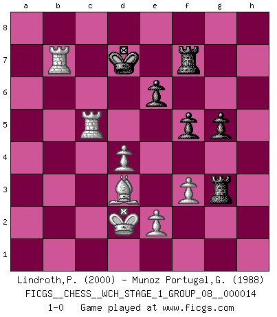 Last move : 1-0 2015 January 29 18:37:8 [Event "FICGS__CHESS__WCH_STAGE_1_GROUP_08__000014"] [Site "FICGS"] [Date "2014.11.01"] [Round "1"] [White "Lindroth,Pasi"] [Black "Munoz Portugal,Guillermo"] [Result "1-0"] [WhiteElo "2000"] [BlackElo "1988"] 1.Nf3 c5 2.c4 Nf6 3.Nc3 e6 4.g3 Nc6 5.Bg2 d5 6.cxd5 Nxd5 7.d4 cxd4 8.Nxd4 Nxc3 9.bxc3 Nxd4 10.Qxd4 Qxd4 11.cxd4 Bb4 12.Bd2 Bxd2 13.Kxd2 Rb8 14.Rhc1 Kd8 15.a4 h6 16.a5 Re8 17.Be4 Re7 18.f3 Rc7 19.Rcb1 f5 20.Bd3 Bd7 21.Rb4 Ke7 22.Rab1 Kd6 23.h4 Bc6 24.Rc4 g5 25.hxg5 hxg5 26.Rc5 Rh8 27.Rbc1 Rh3 28.a6 Rf7 29.axb7 Bxb7 30.Ra1 Rxg3 31.Rxa7 Kd7 32.Rxb7+ 1-0 Reti Opening Player White won this chess game. Follow this game move after move (download)The only thing Chess players have in common is Chess. (Lodewijk Prins) Ivan Sokolov treibt mich als Beifahrer an mit go Loeky go - . (Loek van Wely) Un entendimiento minucioso de las típicas continuaciones de mate hacen de las mas complicadas combinaciones de sacrificio que conducen hacia ellas no solo no dificiles, sino casi un asunto de rutina. (Siegbert Tarrasch) Soyez une menace à chaque fois que vous vous asseyez pour jouer. (Ken Smith) Memory is a way of holding onto the things you love, the things you are, the things you never want to lose. (from the television show: The Wonder Years)