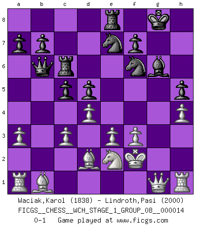 Last move : 0-1 2015 April 10 18:16:24 [Event "FICGS__CHESS__WCH_STAGE_1_GROUP_08__000014"] [Site "FICGS"] [Date "2014.11.01"] [Round "1"] [White "Waciak,Karol"] [Black "Lindroth,Pasi"] [Result "0-1"] [WhiteElo "1838"] [BlackElo "2000"] 1.d4 Nf6 2.c4 e6 3.Nc3 Bb4 4.f3 d5 5.a3 Bxc3+ 6.bxc3 c5 7.e3 O-O 8.cxd5 exd5 9.Ne2 Qc7 10.Nf4 Re8 11.Kf2 g5 12.Ne2 g4 13.h3 gxf3 14.gxf3 Bf5 15.Ng3 Bg6 16.h4 h5 17.Bd3 Nc6 18.Ne2 Ne7 19.Bb1 Rac8 20.Qg1 Qb6 21.Bd2 Rc6 0-1 This chess game has been lost on time (started : 2014.11.01 21:28:10) Comment by player 1 : Karol Waciak : He's probably misspelled his *real* name :) Nimzo-Indian : Kmoch variation Kingside Castling by player Black (move 7) Player Black won this chess game. Follow this game move after move (download)Of Chess it has been said that life is not long enough for it, but that is the fault of life, not Chess. (William Ewart Napier) Im Schach gewinnt jeder. Hat man Freunde am Spiel - und das ist die Hauptsache - ist auch der Verlust einer Partie kein Unglück. (David Bronstein) El Ajedrez, como la música, como el amor, tiene el poder de hacer feliz a la gente. (Siegbert Tarrasch) Aux échecs, l'amour-propre est satisfait quand on remporte la victoire, mais il n'y a pas de honte à être battu. (Benjamin Franklin) If we don't succeed, we run the risk of failure. (George W. Bush)