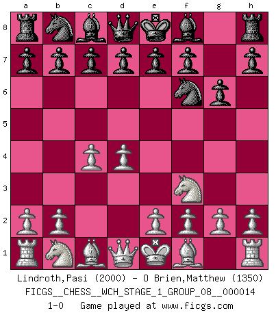 Last move : 1-0 2014 December 6 12:59:10 [Event "FICGS__CHESS__WCH_STAGE_1_GROUP_08__000014"] [Site "FICGS"] [Date "2014.11.01"] [Round "1"] [White "Lindroth,Pasi"] [Black "O Brien,Matthew"] [Result "1-0"] [WhiteElo "2000"] [BlackElo "1350"] 1.d4 Nf6 2.Nf3 g6 3.c4 1-0 This chess game has been lost on time (started : 2014.11.01 21:28:10) King's Indian : East Indian defense Player White won this chess game. Follow this game move after move (download)Excellence at Chess is one mark of a scheming mind. (Sir Arthur Conan Doyle) Es gibt Leute, die glauben, alles wäre vernünftig, was man mit einem ernsthaften Gesicht tut. (Georg Christoph Lichtenberg) El Ajedrez es un regaderazo frío para la mente. (Sir John Simon) Tous ces prétendus hommes politiques sont les pions, les Cavaliers, les Tours ou les Fous d'une partie d'échecs qui se jouera tant qu'un hasard ne renversera pas l'échiquier. (Honoré de Balzac) Hold em is to stud what chess is to checkers. (Johnny Moss)