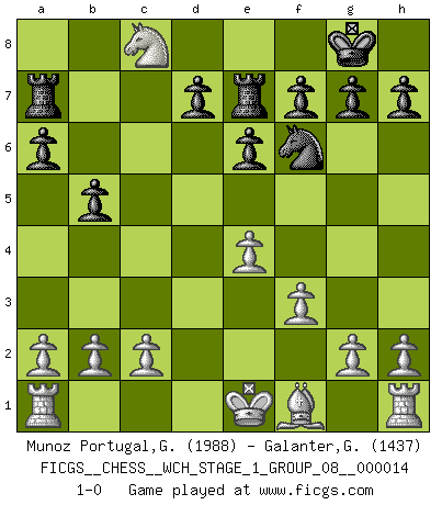 Last move : 1-0 2014 November 16 2:37:27 [Event "FICGS__CHESS__WCH_STAGE_1_GROUP_08__000014"] [Site "FICGS"] [Date "2014.11.01"] [Round "1"] [White "Munoz Portugal,Guillermo"] [Black "Galanter,Gregory"] [Result "1-0"] [WhiteElo "1988"] [BlackElo "1437"] 1.e4 c5 2.Nc3 e6 3.Nf3 Nc6 4.d4 cxd4 5.Nxd4 Be7 6.Ndb5 Nf6 7.Nd6 Bxd6 8.Qxd6 Qe7 9.Bf4 O-O 10.Qxe7 Nxe7 11.Bd6 Re8 12.f3 a6 13.Na4 b5 14.Nb6 Ra7 15.Bxe7 Rxe7 16.Nxc8 1-0 Sicilian : Closed Kingside Castling by player Black (move 9) Player White won this chess game. Follow this game move after move (download)In blitz, the Knight is stronger than the Bishop. (Vlastimil Hort) Korrekt heißt in Deutschland die Haltung eines Mannes, dessen Benehmen nach dem Urteile seiner Nachbarn seiner Stellung angemessen ist. Um korrekt zu sein, muß man sich der Meinung der anderen anpassen... (Emanuel Lasker) Los asuntos humanos son como una partida de Ajedrez: solo aquellos que no lo toman seriamente, pueden ser llamados buenos jugadores. (Hung Tzu Ch'eng) Le moment que je préfère le plus dans une rencontre, c'est celui où je sens que la personnalité de l'adversaire se brise. (Robert Fischer) Whatever you do, don't be bored. This is absolutely the most exciting time we could have possibly hoped to be alive. And things are just starting. (From movie Waking life)