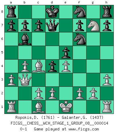 Last move : 0-1 2015 March 15 13:31:30 [Event "FICGS__CHESS__WCH_STAGE_1_GROUP_08__000014"] [Site "FICGS"] [Date "2014.11.01"] [Round "1"] [White "Ropokis,Dimitrios"] [Black "Galanter,Gregory"] [Result "0-1"] [WhiteElo "1761"] [BlackElo "1437"] 1.Nc3 d5 2.e4 d4 3.Nce2 e5 4.Ng3 Bb4 5.a3 Ba5 6.b4 Bb6 7.Nf3 Bg4 8.h3 Bxf3 9.Qxf3 Nf6 10.Bc4 Nbd7 11.Nf5 Nf8 12.Nxg7+ Ke7 13.Nf5+ Ke8 14.Qb3 Qd7 15.Ng7+ Kd8 0-1 This chess game has been lost on time (started : 2014.11.01 21:28:10) Dunst (Sleipner, Heinrichsen) Opening Player Black won this chess game. Follow this game move after move (download)In order to improve your game, you must study the endgame before everything else, for whereas the endings can be studied and mastered by themselves, the middle game and the opening must be studied in relation to the endgame. (Jose Raul Capablanca) Am wohlsten fühle ich mich, wenn ich sehe, wie sich mein Gegner im Todeskampf windet. (Robert James Fischer) Personalmente, yo prefiero mirar hacia el futuro en donde un programa de computadora gane el título mundial de Ajedrez. La humanidad necesita una lección de humildad. (Richard Dawkings) Il (Jacob Murray) ne joue pas pour le bon coup, mais pour le meilleur. (Eloi Relange) If you don't practice you don't deserve to win. (Andre Agassi)