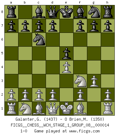 Last move : 1-0 2014 December 6 0:53:30 [Event "FICGS__CHESS__WCH_STAGE_1_GROUP_08__000014"] [Site "FICGS"] [Date "2014.11.01"] [Round "1"] [White "Galanter,Gregory"] [Black "O Brien,Matthew"] [Result "1-0"] [WhiteElo "1437"] [BlackElo "1350"] 1.e4 e5 2.Nf3 Nc6 3.g3 1-0 This chess game has been lost on time (started : 2014.11.01 21:28:10) Konstantinopolsky Opening Player White won this chess game. Follow this game move after move (download)It is not a move, even the best move that you must seek, but a realizable plan. (Eugene Znosko-Borovsky) Im Schach gibt es keinen Platz für Galanterie. (Irving Chernev) Durante una competencia de Ajedrez, un Maestro de Ajedrez deberá ser una combinación de presa de caza y un Monge. (Alexander Alekhine) A chaque perte on perd un peu de soi. (Joël Lautier) There are 10 types of people in this world: those who understand binary and those who don't. (Anonymous)