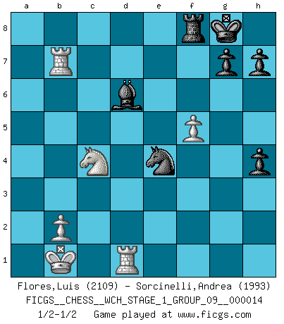 Last move : 1/2-1/2 2014 December 6 18:27:22 [Event "FICGS__CHESS__WCH_STAGE_1_GROUP_09__000014"] [Site "FICGS"] [Date "2014.11.01"] [Round "1"] [White "Flores,Luis"] [Black "Sorcinelli,Andrea"] [Result "1/2-1/2"] [WhiteElo "2109"] [BlackElo "1993"] 1.e4 c5 2.Nf3 d6 3.d4 cxd4 4.Nxd4 Nf6 5.Nc3 a6 6.Be3 e5 7.Nb3 Be7 8.f3 Be6 9.Qd2 O-O 10.O-O-O Nbd7 11.g4 b5 12.g5 b4 13.Ne2 Ne8 14.f4 a5 15.f5 a4 16.Nbd4 exd4 17.Nxd4 b3 18.Kb1 bxc2+ 19.Nxc2 Bb3 20.axb3 axb3 21.Na3 Ne5 22.h4 Ra4 23.Bd4 Qa8 24.Qe3 Kh8 25.Bb5 Ra5 26.Bc3 Rxb5 27.Nxb5 Qa2+ 28.Kc1 Nc4 29.Qd3 Qa1+ 30.Qb1 Qa4 31.Na3 Ne5 32.Rh3 Qc6 33.Kd2 f6 34.Bxe5 dxe5 35.Rxb3 fxg5 36.Qc2 Qa8 37.Kc1 gxh4 38.Kb1 Nf6 39.Nc4 Qxe4 40.Qxe4 Nxe4 41.Nxe5 Kg8 42.Rb7 Bd6 43.Nc4 1/2-1/2 Sicilian : Najdorf, Byrne (English) attack Kingside Castling by player Black (move 9) Queenside Castling by player White (move 10) This chess game ended in a draw. Follow this game move after move (download)I am still a victim of Chess. It has all the beauty of art and much more. It cannot be commercialized. Chess is much purer than art in its social position. (Marcel Duchamp) Ich verachte Kasparow. (Viktor Kortschnoi) Bobby es la celebridad menos entendida y malinterpretada que camina el la faz de esta tierra. (Yasser Seirawan) Mon pion favori sur ma case favorite ! Bronstein en parlant d'un coup de pion en h5 quand il avait les Noirs. To send light into the darkness of men's hearts - such is the duty of the artist. (Schumann)