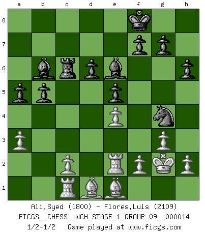 Last move : 1/2-1/2 2015 January 20 0:51:21 [Event "FICGS__CHESS__WCH_STAGE_1_GROUP_09__000014"] [Site "FICGS"] [Date "2014.11.01"] [Round "1"] [White "Ali,Syed"] [Black "Flores,Luis"] [Result "1/2-1/2"] [WhiteElo "1800"] [BlackElo "2109"] 1.e4 c5 2.Nf3 d6 3.d4 cxd4 4.Nxd4 Nf6 5.Nc3 a6 6.Be2 e5 7.Nb3 Be7 8.Qd3 O-O 9.O-O Be6 10.Be3 Nc6 11.a3 Rc8 12.Rfd1 Na5 13.Nxa5 Qxa5 14.Rac1 b5 15.Qd2 Rxc3 16.Bf3 Rfc8 17.bxc3 h6 18.c4 Qxd2 19.Bxd2 Rxc4 20.Re1 Bd8 21.Bb4 Rc6 22.g3 Kf8 23.Kg2 Bb6 24.Bd1 Ng4 25.Re2 a5 26.Be1 1/2-1/2 Sicilian : Najdorf, Opovcensky variation Kingside Castling by player Black (move 8) Kingside Castling by player White (move 9) This chess game ended in a draw. Follow this game move after move (download)The combination player thinks forward; he starts from the given position, and tries the forceful moves in his mind. (Emanuel Lasker) Mit Schach schule ich mein Gefühl für Geometrie, was für Tennis und Schach gleichermaßen wichtig ist. (Boris Becker) Cuando tu no sabes absolutamente que mas hacer, es tiempo de entrar en pánico. (John van der Wiel) L'attaque fait le spectacle, la défense gagne les matchs. (Dicton footballistique) The faster the computer, the slower the brain. (Thibault de Vassal)