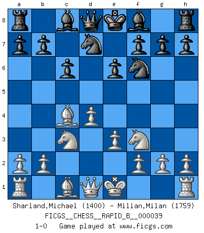 Last move : 1-0 2007 April 11 4:42:9 [Event "FICGS__CHESS__RAPID_B__000039"] [Site "FICGS"] [Date "2007.02.23"] [Round "1"] [White "Sharland,Michael"] [Black "Milian,Milan"] [Result "1-0"] [WhiteElo "1400"] [BlackElo "1759"] 1.d4 d5 2.Nf3 e6 3.c4 Nf6 4.Nc3 c6 5.e3 Nbd7 6.Bd3 dxc4 7.Bxc4 1-0 This chess game has been lost on time (started : 2007.02.23 8:58:7) Queen's pawn game Player White won this chess game. Follow this game move after move (download)When you play Bobby, it is not a question if you win or lose. It is a question if you survive. (Boris Spassky) Man wirke der falschen Auffassung entgegen, als ob jeder Zug Unmittelbares zu leisten habe; auch Werte- und Ruhezüge haben ihre Existenzberechtigung. (Aaron Nimzowitsch) Cuando estes solo, cuando te sientas un extraño en el mundo, juega al Ajedrez. Esto levantará tu espiritu y será tu consejero de guerra. (Aristóteles) Psychologiquement, tu dois avoir confiance en toi même, mais cette confiance doit être basée sur des faits. (Robert Fischer) He who is a good ruler must first have been ruled. (Aristotle)
