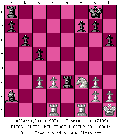 Last move : 0-1 2014 December 2 20:5:5 [Event "FICGS__CHESS__WCH_STAGE_1_GROUP_09__000014"] [Site "FICGS"] [Date "2014.11.01"] [Round "1"] [White "Jefferis,Des"] [Black "Flores,Luis"] [Result "0-1"] [WhiteElo "0938"] [BlackElo "2109"] 1.e4 c5 2.c4 Nc6 3.d3 e6 4.Nc3 Nf6 5.Bg5 Be7 6.Nf3 h6 7.Bh4 O-O 8.Be2 b6 9.O-O Bb7 10.Bg3 Nh5 11.Nd2 Nxg3 12.fxg3 Bf6 13.Qc2 d5 14.exd5 Nd4 15.Qd1 exd5 16.cxd5 Nxe2+ 17.Qxe2 Bd4+ 18.Kh1 Bxc3 19.bxc3 Re8 20.Qf3 Qxd5 21.Qxd5 Bxd5 22.Nf3 Re3 23.Rad1 Bxa2 0-1 Sicilian defense Kingside Castling by player Black (move 7) Kingside Castling by player White (move 9) Player Black won this chess game. Follow this game move after move (download)Different people feel differently about resigning. (Bobby Fischer) Ich habe die Schachforschung dermaßen betrieben, dass sie auf eine wissenschaftliche Basis gestellt wurde. (Mikhail Moiseyevich Botvinik) Cuando tu casa esta en llamas, no puedes ser molestado por tus vecinos. O, como decinos en Ajedrez, si tu Rey esta bajo ataque, no te preocupa perder un Peón del lado de la Reina. (Gary Kasparov) Il s'avisa de me proposer d'apprendre les échecs qu'il jouait un peu... me voilà forcené des échecs. J'achète un échiquier, je m'enferme dans ma chambre, j'y passe des jours et des nuits à vouloir apprendre par cur toutes les parties. (Jean-Jacques Rousseau, Confessions) When you've done things right people won't know you've done anything at all. (Futurama)